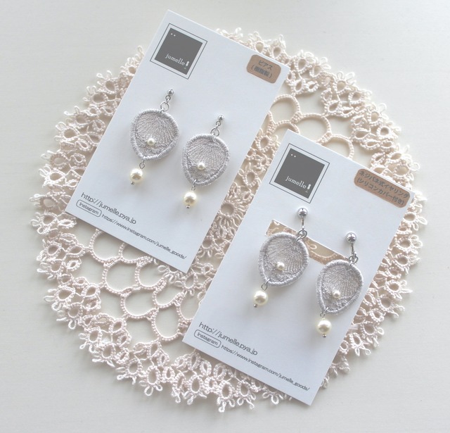 バッグや小物を作る jumelleの上品で繊細な刺繍が映える オーガンジー刺繍 イヤリング・ピアス。 ONO*10thアニバーサリー記念オリジナル作品です☆ レースの様な模様の刺繍は花びらを思わせるフォルム。 びわ湖産 淡水パールが大丈1粒づつ着いています jumelleオリジナルBOX入り ギフトにも最適です☆ <サイズ> 横:2cm 縦: 4cm 白とベージュピンクの2配色 <素材> オーガンジー(ポリエステル100%) 刺繍糸 (ミシン刺繍用 ポリエステル100%) 、日本製 樹脂ピアス (アクリル+ポリプロピレン )ボール部分:本ロジウム)、 手芸用接着剤、ほつれ止め 琵琶湖淡水真珠 S2粒 M2粒 <作家のご紹介> jumelle(じゅめーる)ヨシオカナツミ カバンやコモノを中心としたハンドメイド雑貨のデザイン/制作を手掛ける『jumelle』。 オリジナル刺繍を施した布をメインとした雑貨をつくっています。 『jumelle』とはフランス語で双子を意味します。雑貨の作り手と使ってくださるお客さま そのどちらが欠けても成り立たない関係性を双子になぞらえました。 【使って完成する雑貨】をコンセプトに、その人の日常に自然になじむような、 オリジナルで愛着のわくような、トレンドに左右されず長く愛用できるモノづくりを目指しています。 instagram @jumelle_goods *撮影時の光の入り方、または、モニターやブラウザの種類により、実際の製品と異なる色合いや濃度で表現される場合がありますのでご了承をお願い致します。 *ご発送方法 ご購入時にお選び下さい ●クリックポスト(追跡可能)ご自宅の郵便受けへのお届け ●宅急便