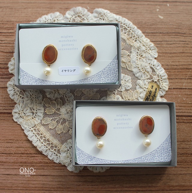 元橋みぎわ 陶イヤリング・ピアス 飴釉 楕円パール