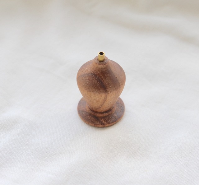 木工作家 本田陵子さんのドライフラワー用の一輪挿し。 ヨーロッパのアンティークなキャンドルホルダーの様な滑らかなフォルムは、 細い木枝やドライフラワーを飾れる真鍮の穴が空いています。 無垢の木の風合いが生かされた木目の摸様が温かく、そのままオブジェとして飾っても周囲の雰囲気が魅力的になります 「木工旋盤で製作しています。形は1つ1つ微妙に変えています。どれも同じではない1点ものです」 ドライフラワーベース サイズ:幅 3 高さ4.8cm 口3mm 素材:クルミ(オイル塗装)/真鍮 価格:¥1,200(+税) 本田綾子プロフィール 大阪生まれ。京都伝統工芸大学校(木工芸専攻)卒業後 京都の工房で勤めながら制作を始める。 無垢の木の表情を活かすことを大切にしながら、 うつわなどを作っています。 ------------------- *光の入り方により、色合いや濃さが違って見えます。また、モニターやブラウザの種類により、実際の製品と異なる色合いや濃度で表現される場合がありますのでご了承をお願い致します。 *ご発送方法について ・ヤマト宅急便