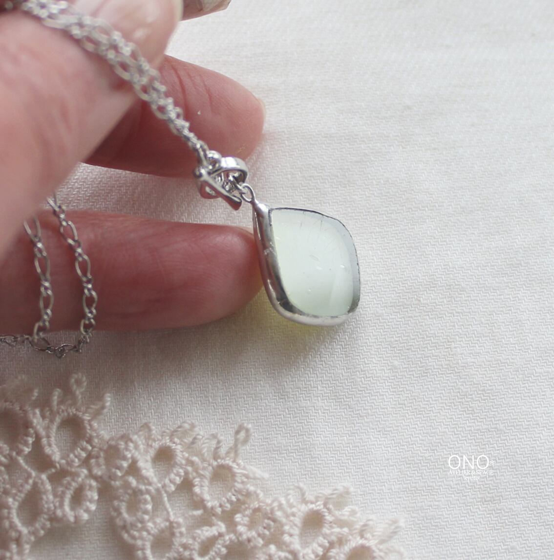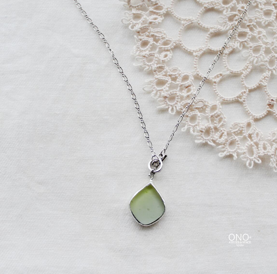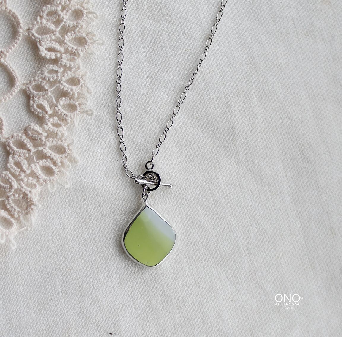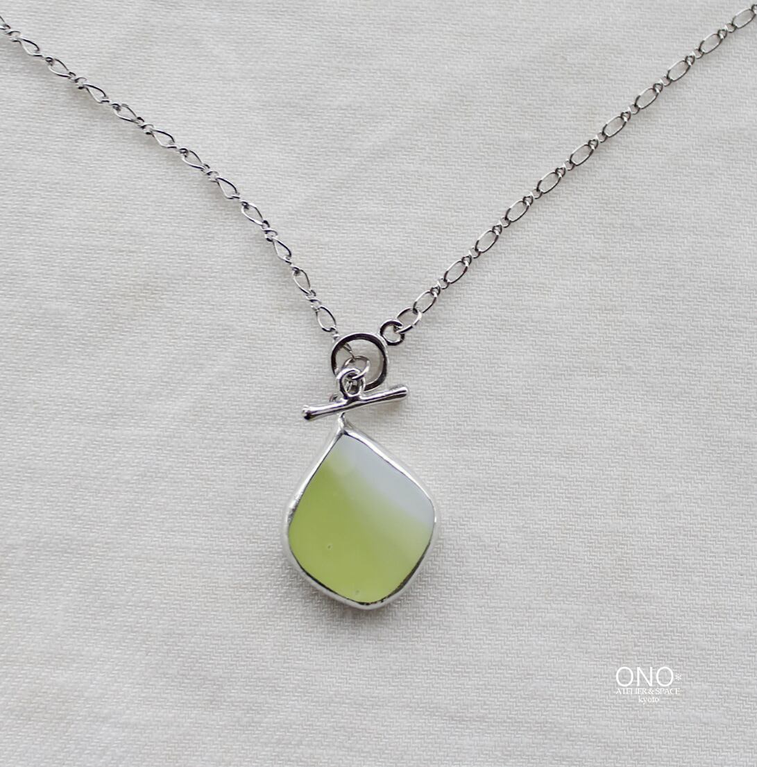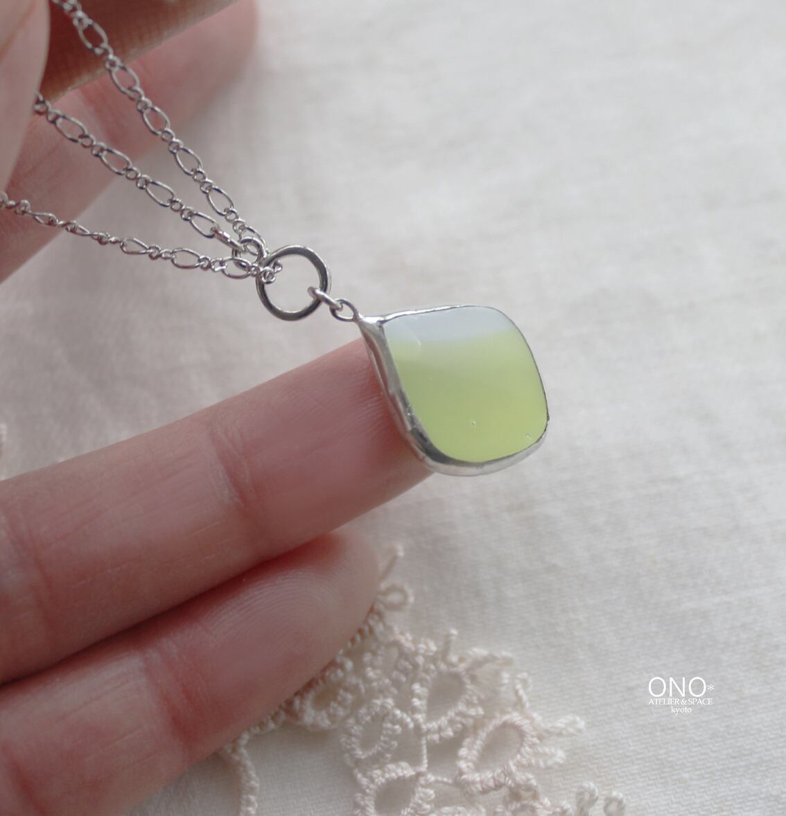 丸みのあるスクエアのトップの硝子はレモンイエローとホワイトの混合。裏表違う表情があります。半透明なので、お洋服の色合いや模様にも 影響なく着けていただけます。