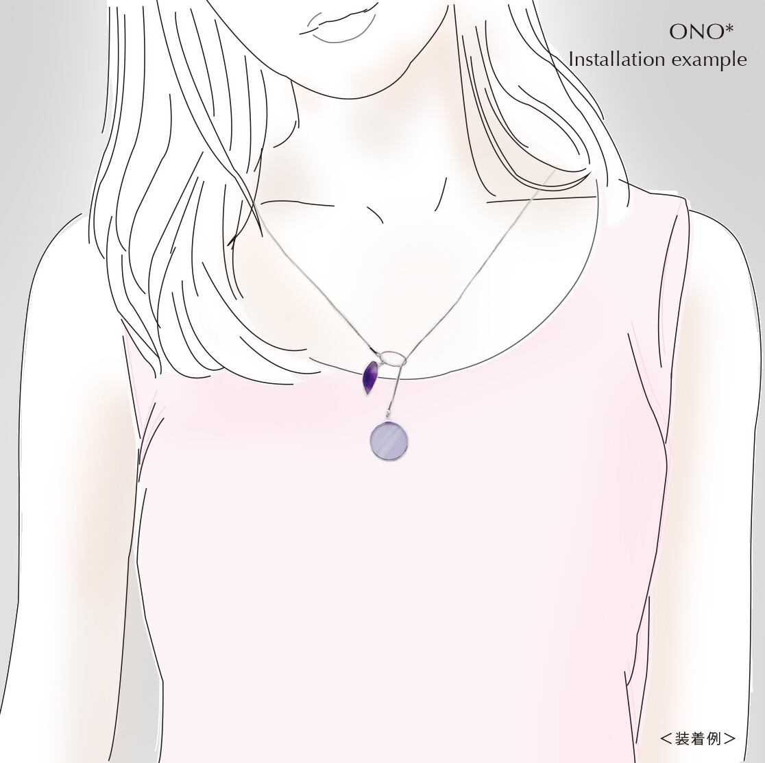 首にかけ胸元で、オーバル形の装飾リングに 丸いガラストップを通して装着します。前で合わせる楽ちんな着け方と、モチーフ同士を重ねたり・離したり 有機的な魅力を持ち様々なデザインを楽しむ事ができます。