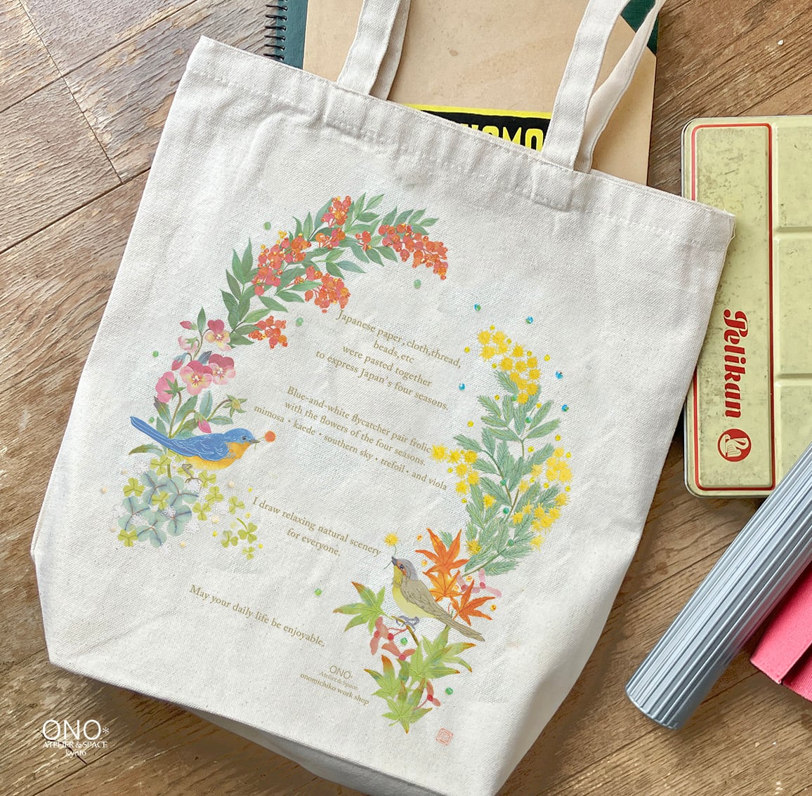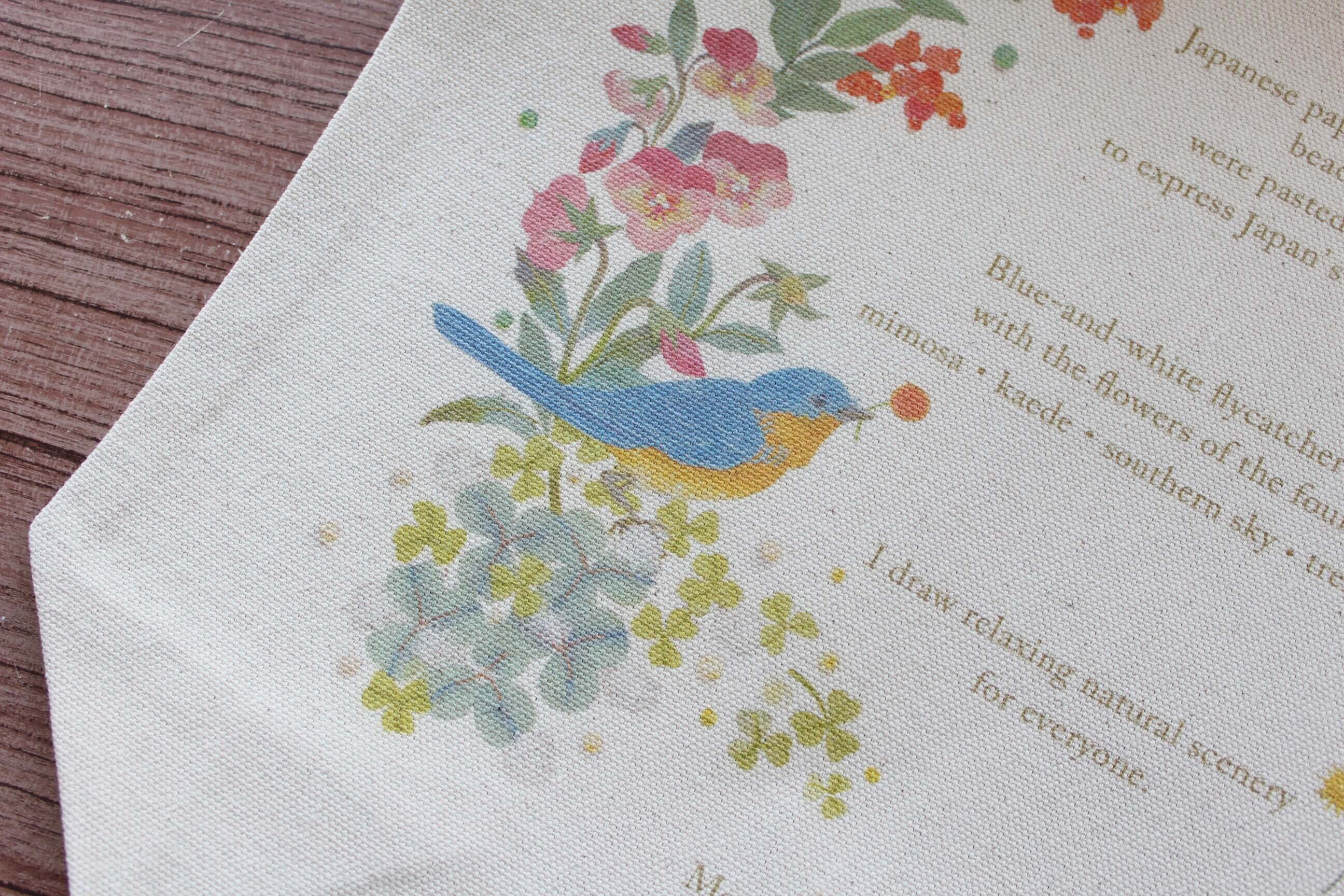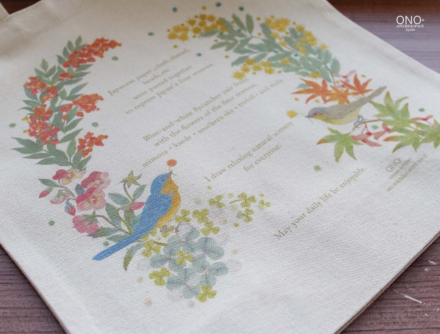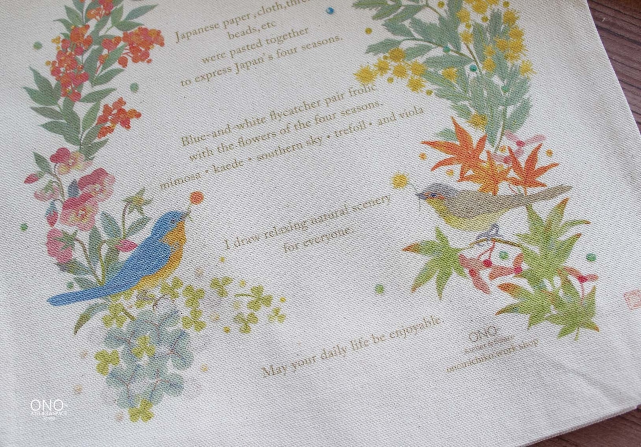 四季折々の草花とルリビタキの番(つがい)が描かれたデザインです。