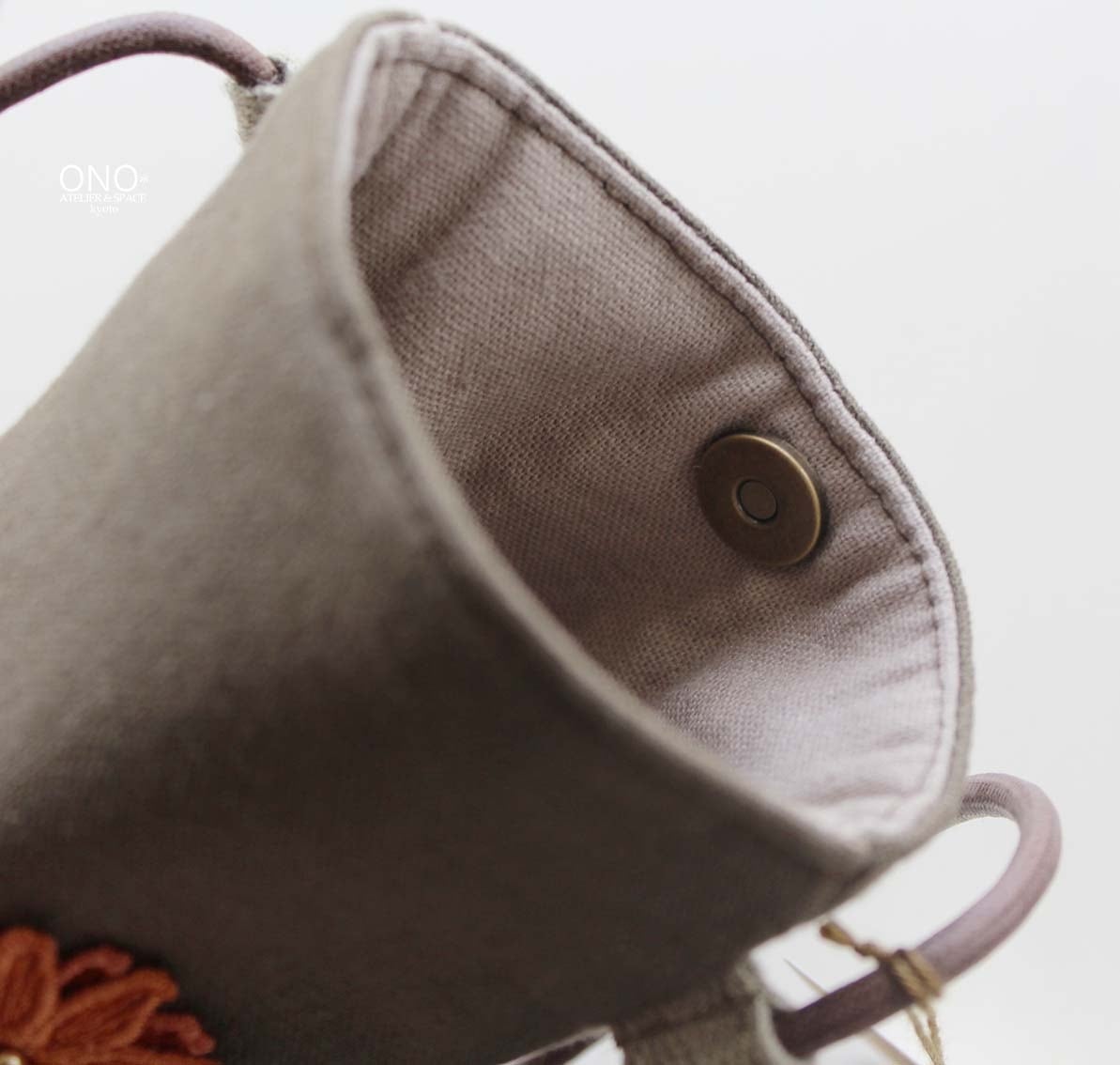新作ブローチと同じモチーフの刺繍がほど施され、アクセサリー感覚で持つ事ができそう。マチ付き・後ろポケットも付いて便利な体裁です。