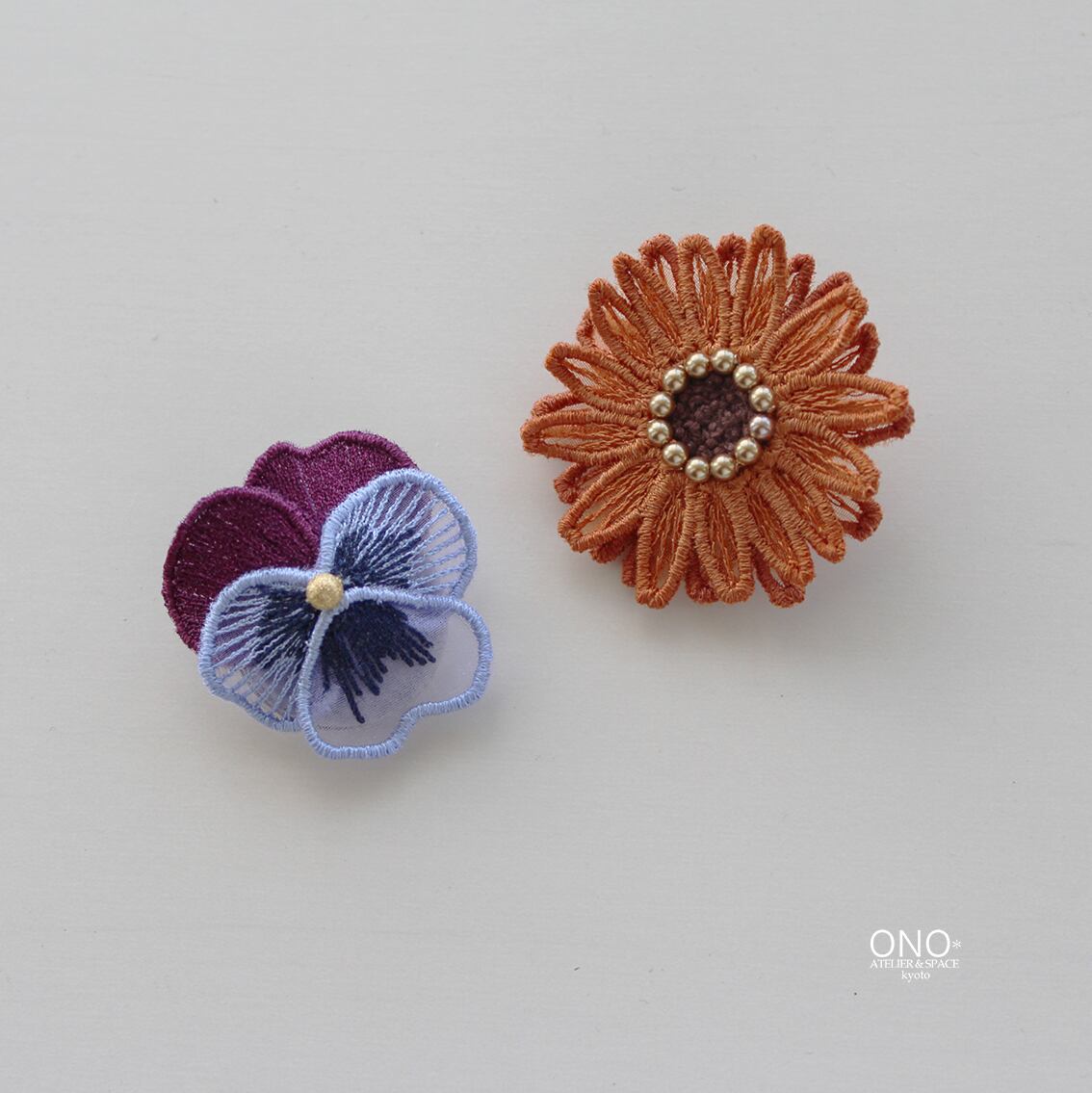 「誠実」「信頼」などの花言葉を持つビオラ。控えめながらも美しい姿を刺繍で表現しました。ハリがありガラスのような質感をもつマットなオーガンジーに一枚一枚の花びらを丁寧に機械刺繍で刺し、パーツを作ります。そしてそれぞれのパーツを立体的に縫い付け仕上げています。パーツの図案はオリジナルです。