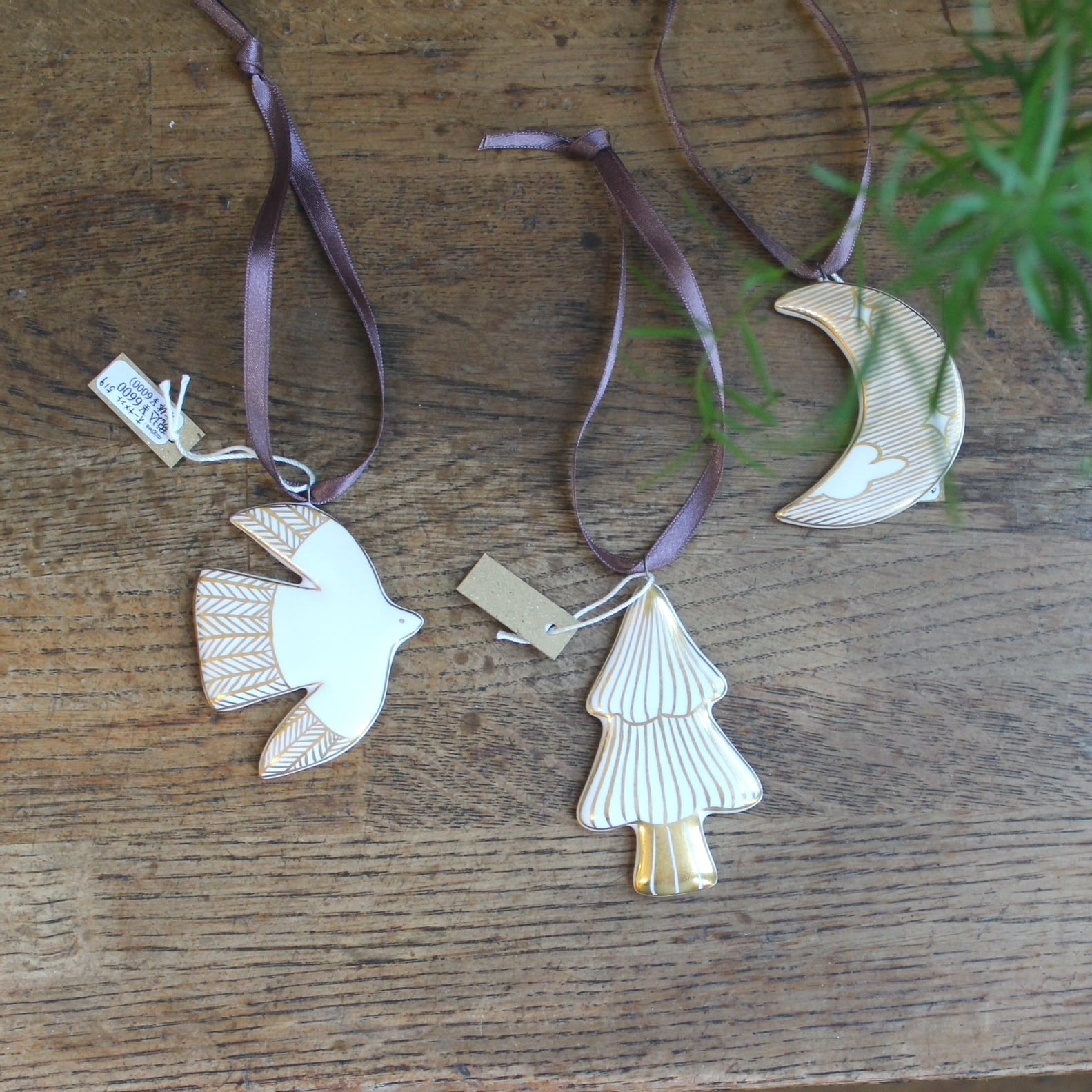 トップの丸カンに結ばれたブラウンのリボンを お部屋の壁やツリーに掛けて飾るルームアクセサリーです。