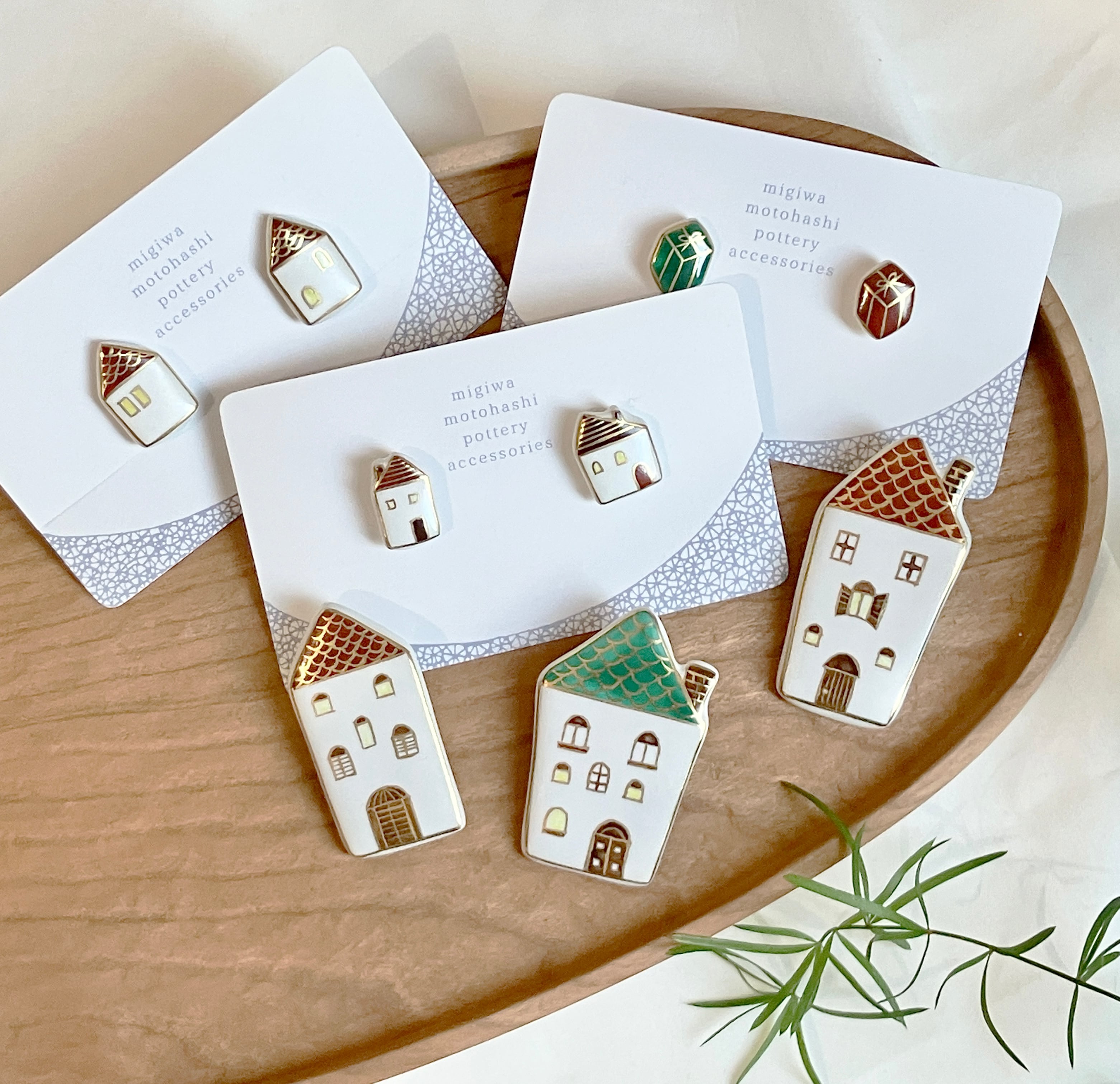 木や鳥、植物をモチーフに金彩や色絵で装飾したアクセサリーを制作