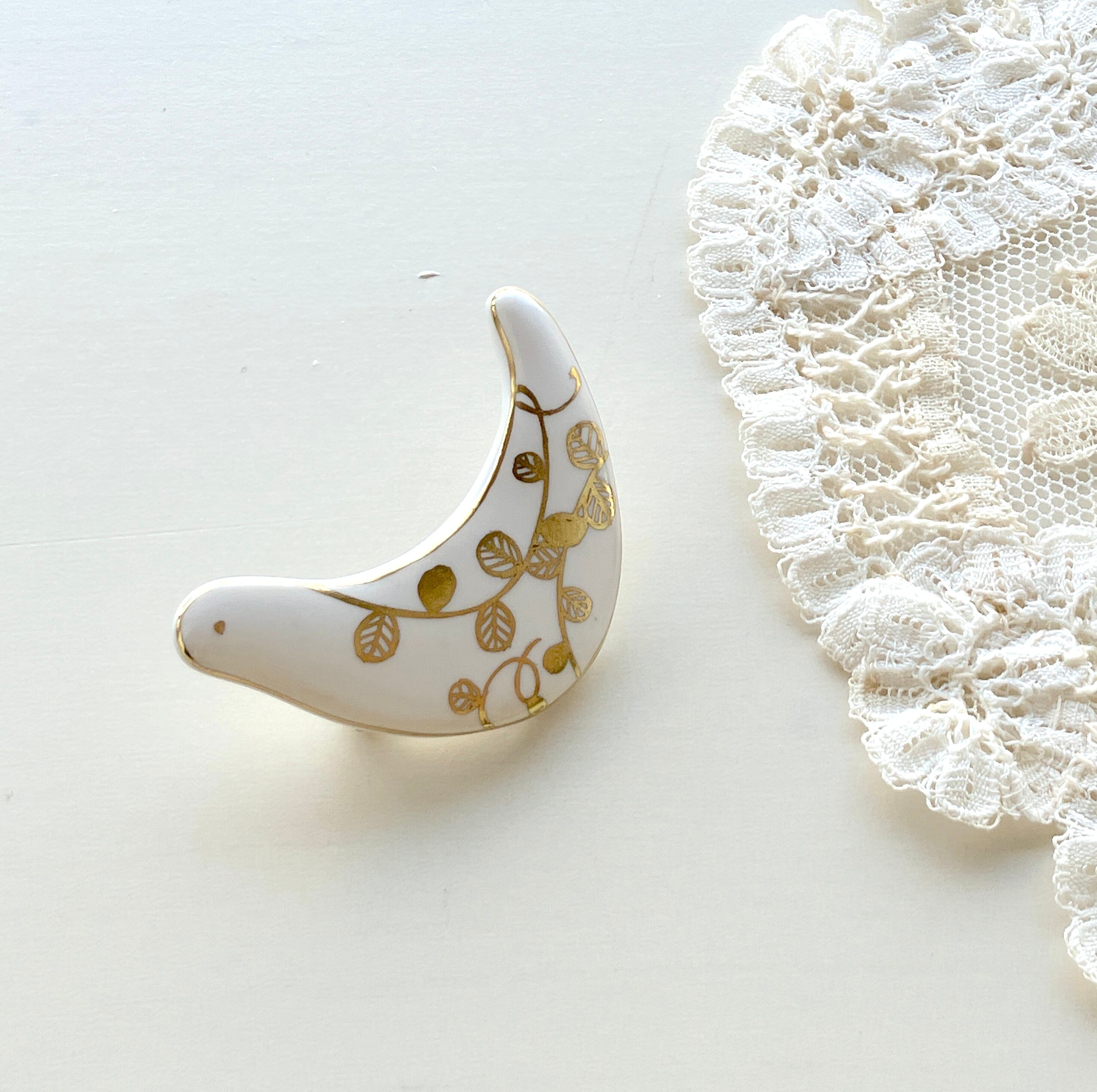 木や鳥、植物をモチーフに金彩や色絵で装飾したアクセサリーを制作