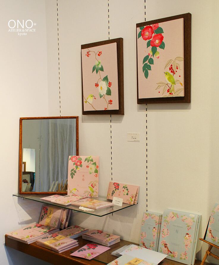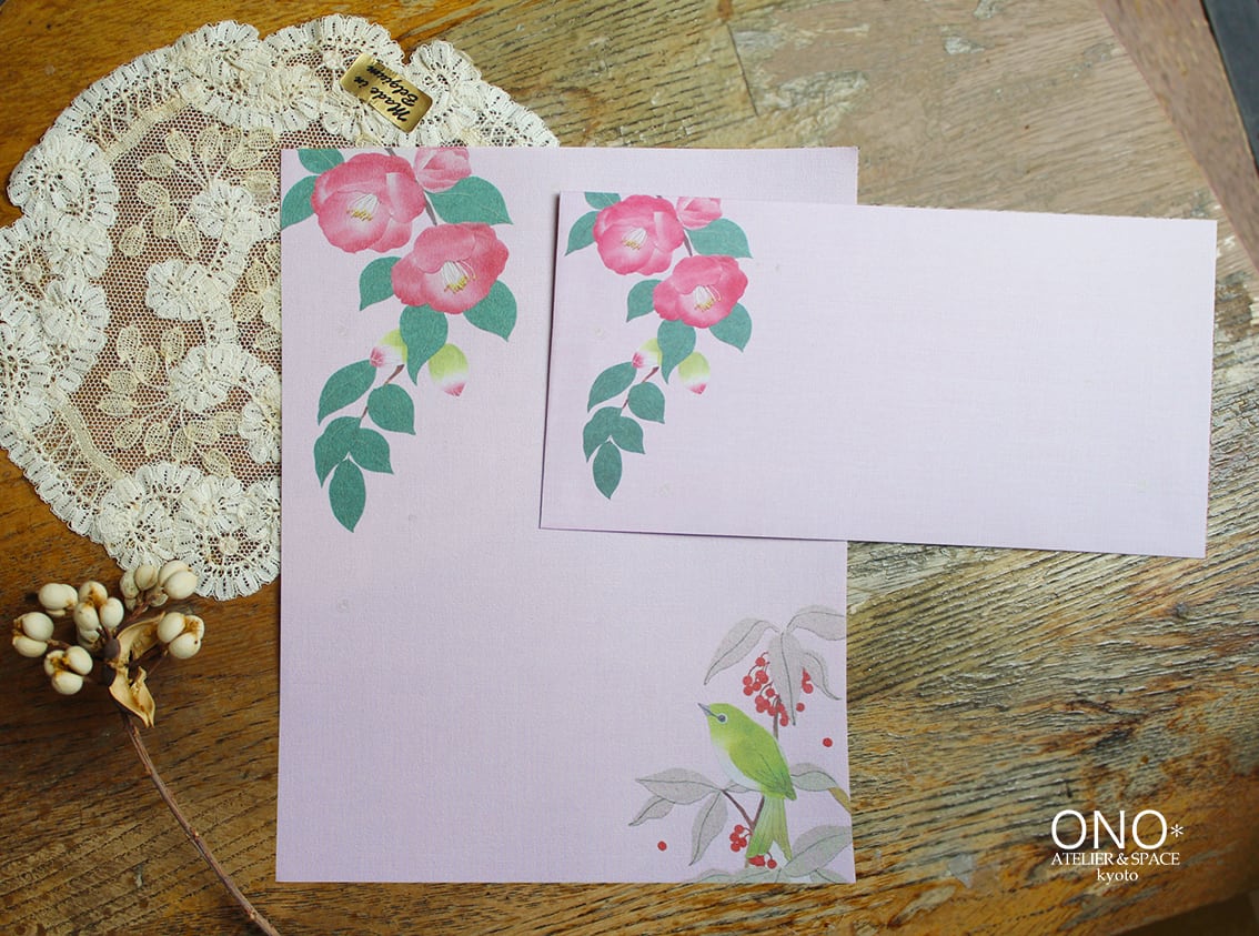 紅白の椿と、万両や赤い実の枝に止まるメジロが表現された作品を印刷した便箋は、温かみのある素材感。