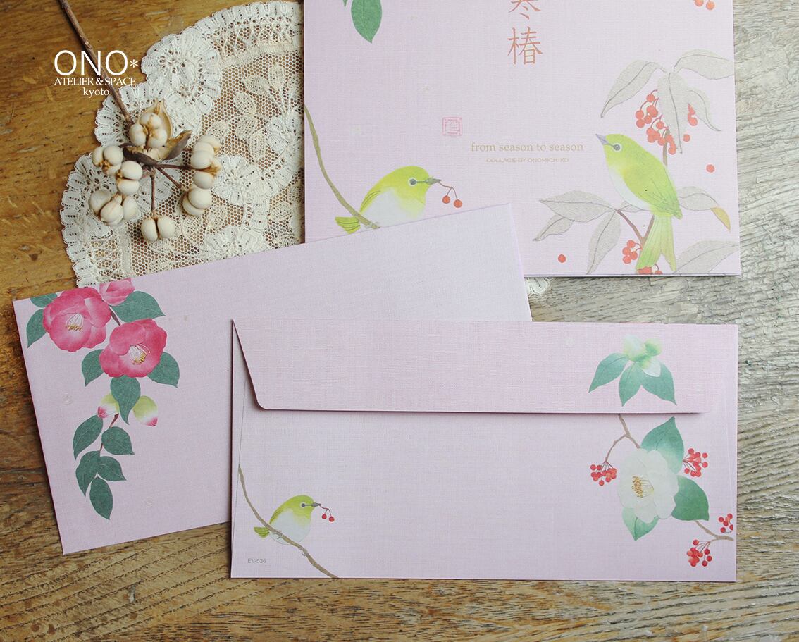 ラージュ作品『椿とメジロ』のコラージュをプリントした横型の封筒。