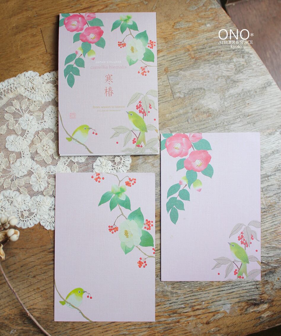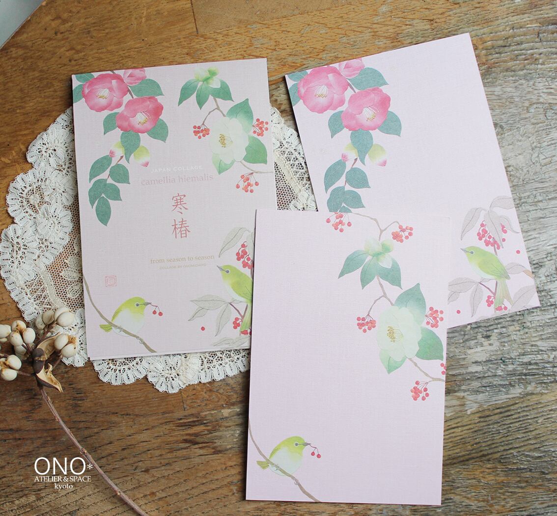 コラージュ作品『椿とメジロ』をデザインし、風合いのある洋紙にプリントしたはがき箋です。