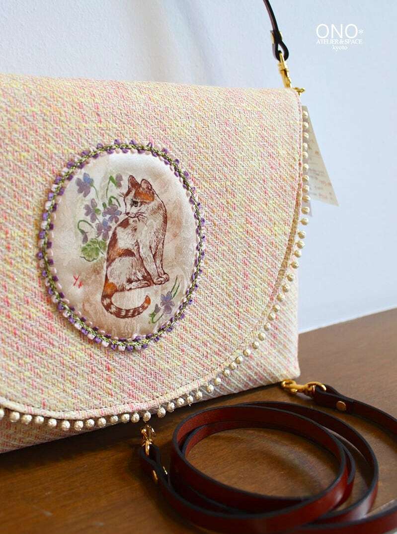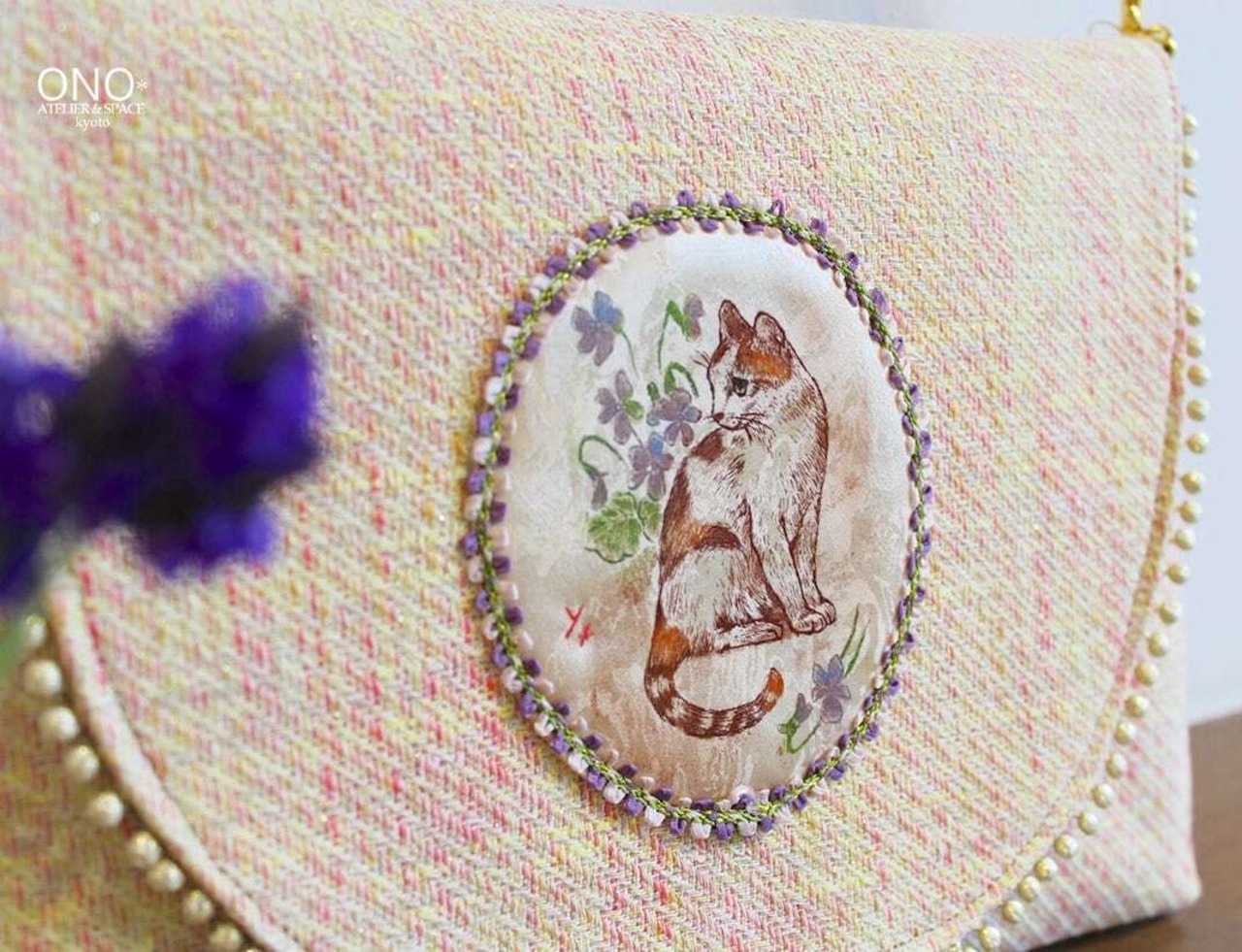 シルクに刷られた猫とスミレの銅版画がアップリケされています。
