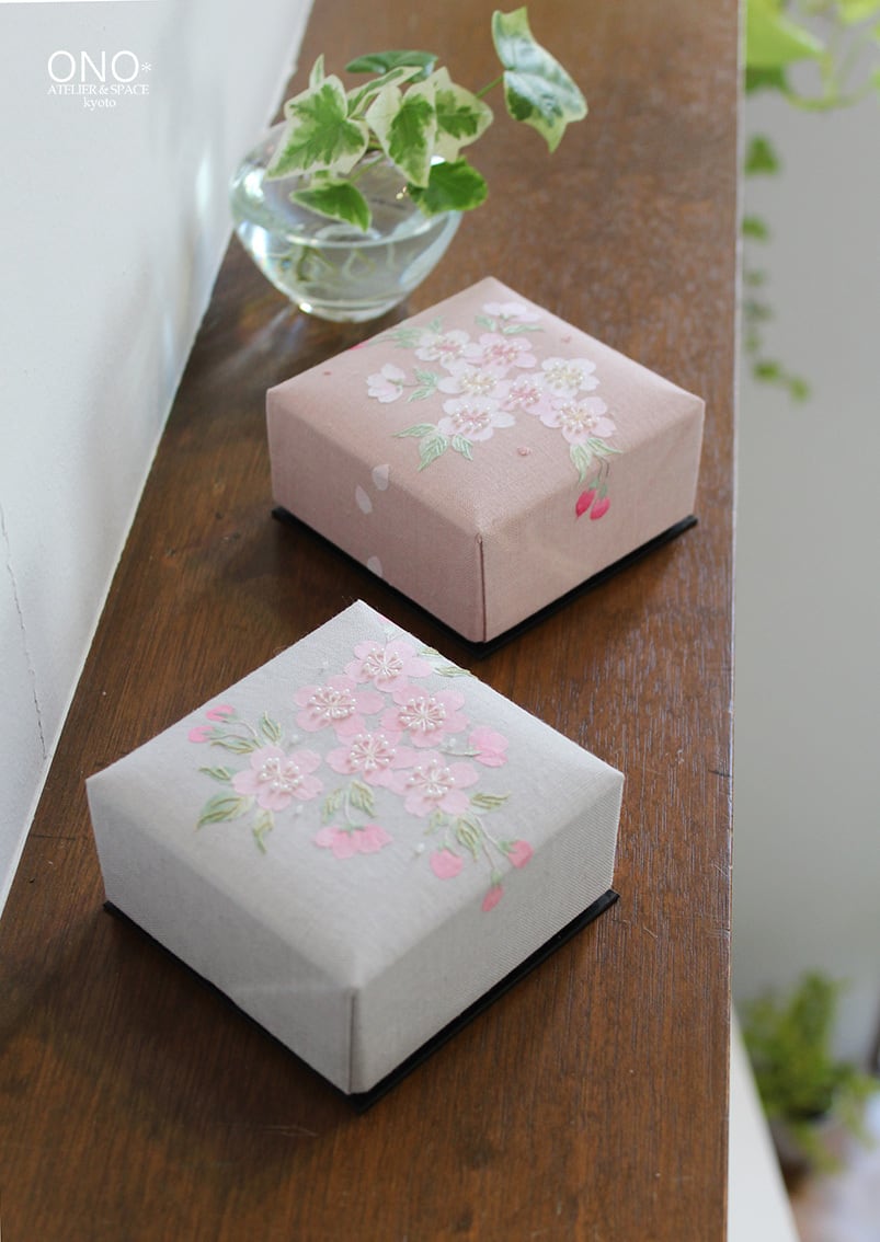 淡いブルーグレイのリネンの貼り箱に、染め和紙・刺繍糸・ビーズを糊で貼り合わせた桜のコラージュ小箱です。