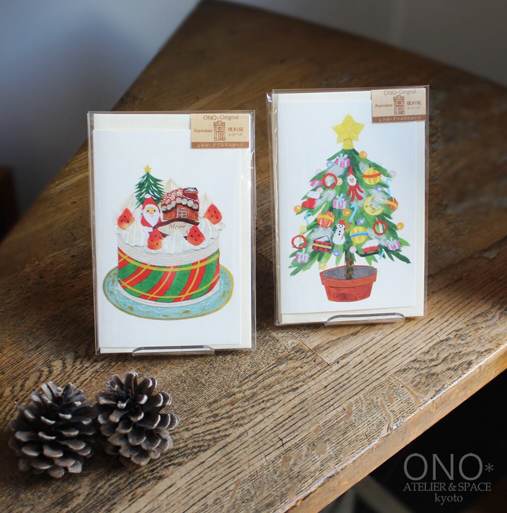 昭和の香り漂うレトロなクリスマスアイテムの貼り絵を印刷した 2つ折りグリーティングカードです。