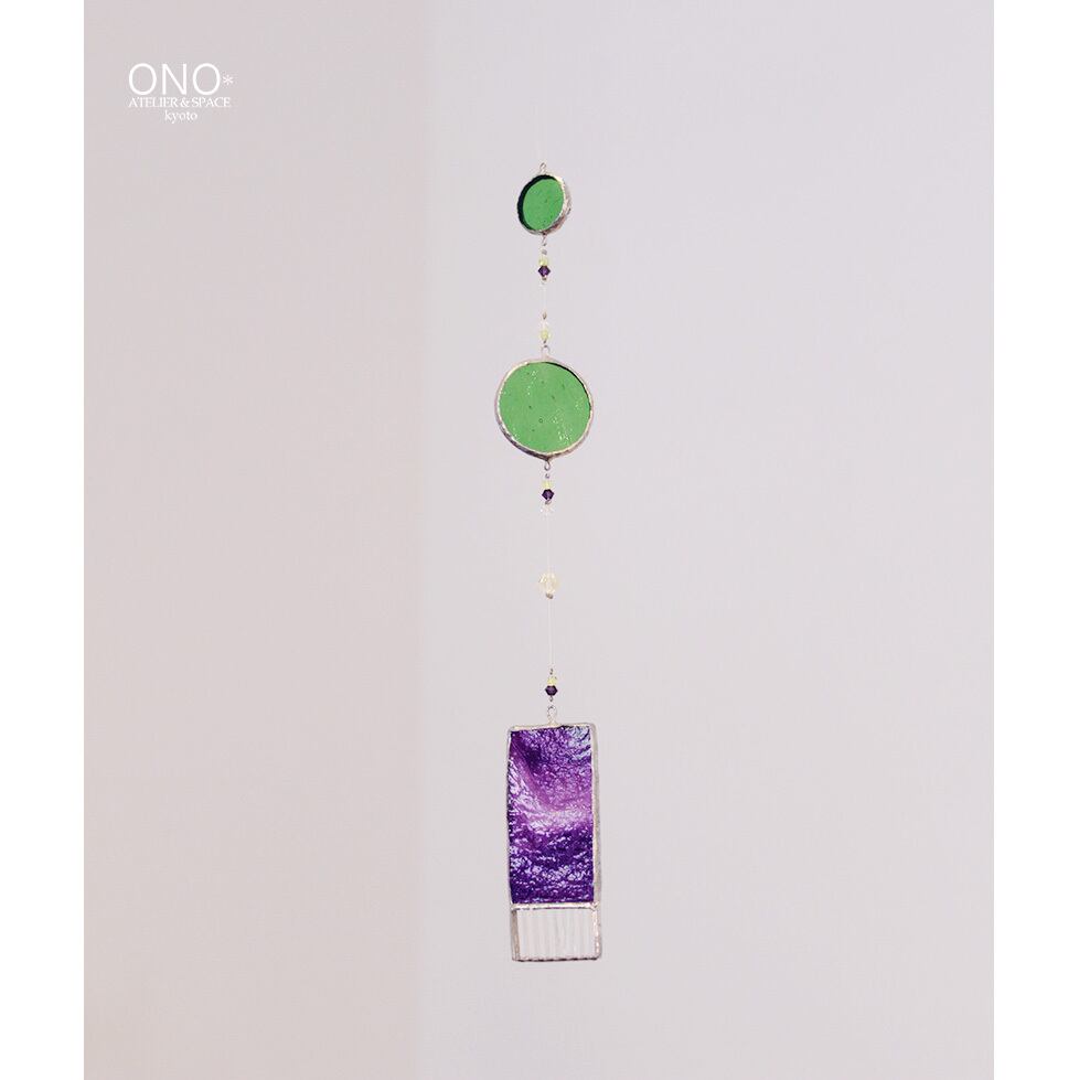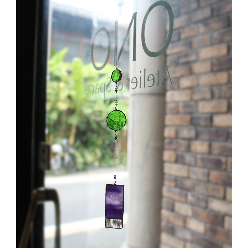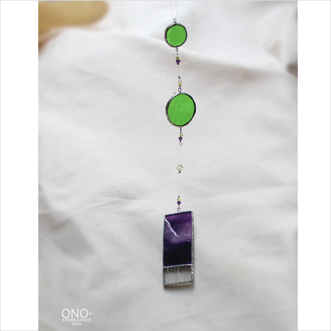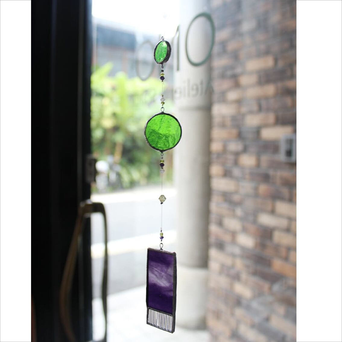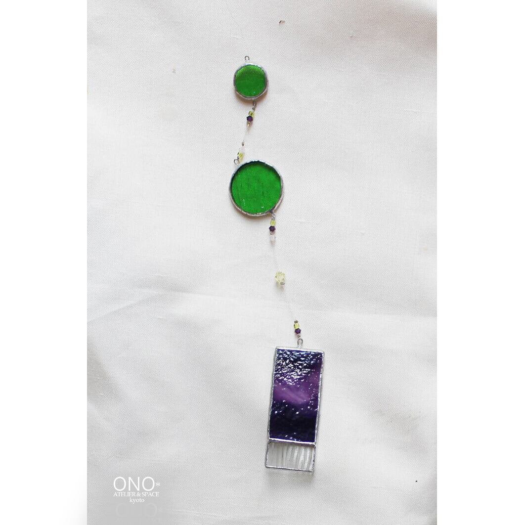 丸と長方形のモチーフが3つ連なったステンドグラスのオーナメントは、