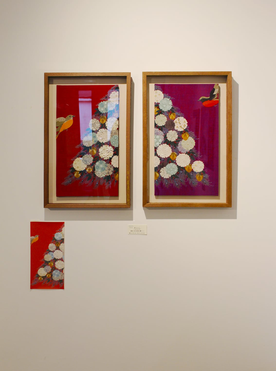松の葉に着物の端切などで雪輪オーナメントやビーズの雪結晶を装飾した和風ツリー。