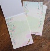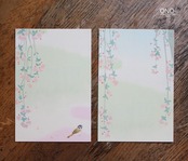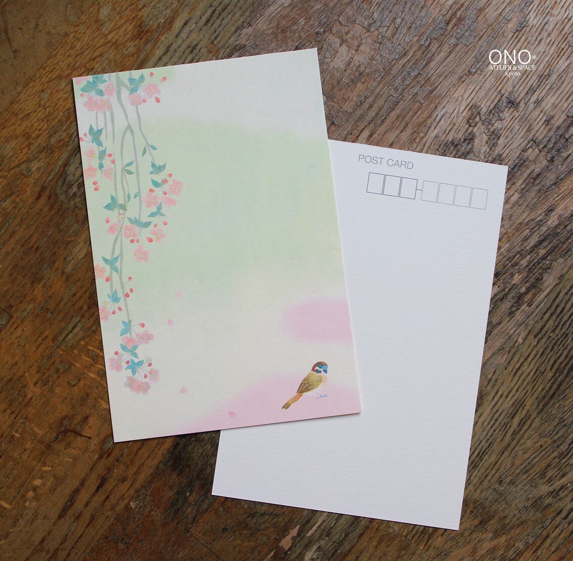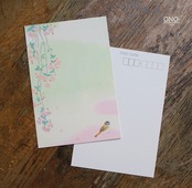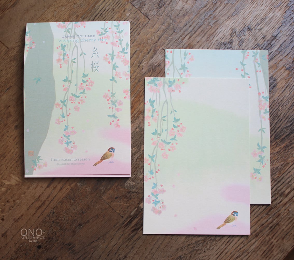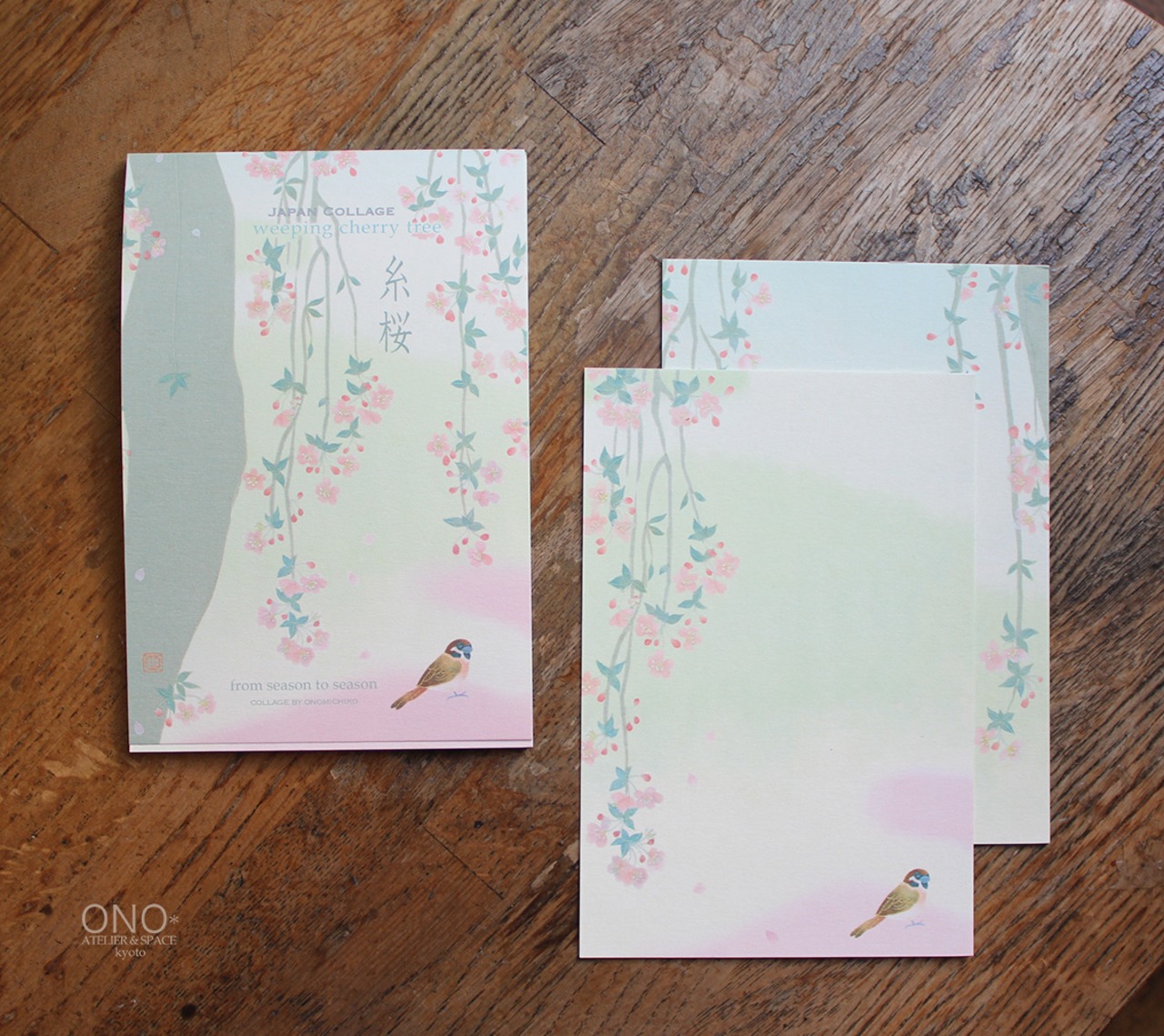 コラージュ作品『枝垂れ桜に雀』をプリントしたはがき箋です。