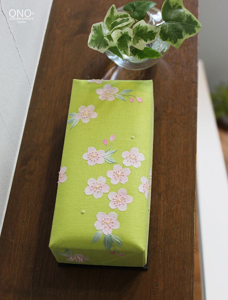 若草色リネンの貼り箱に、染め和紙・刺繍糸・ビーズを糊で貼り合わせた淡い桜のコラージュ。
