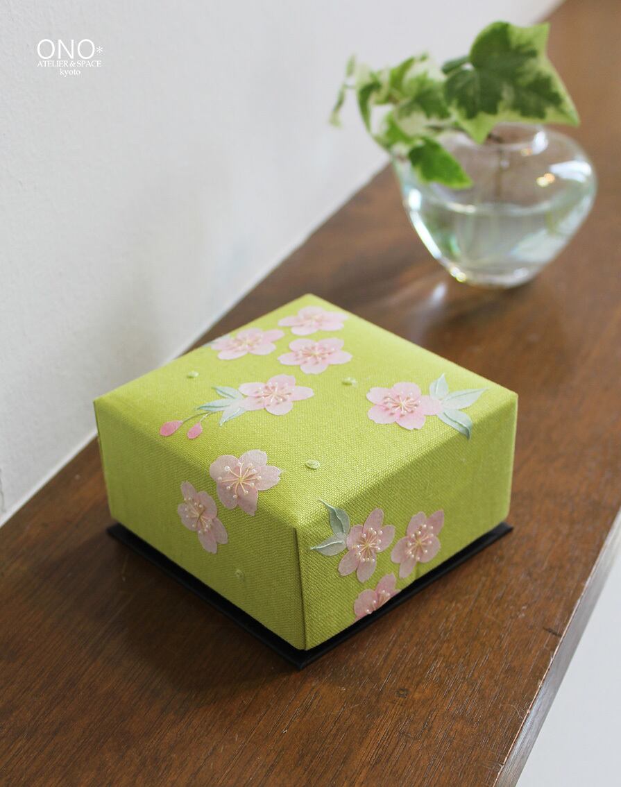 若葉色リネン生地の貼り箱に、染め和紙・刺繍糸・ビーズを糊で貼り合わせた淡い桜のコラージュした小箱です。