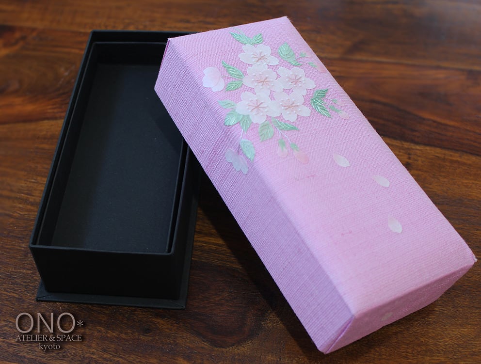 鮮やかなピンク色の麻の貼り箱に、染め和紙・刺繍糸・極小ビンテージビーズを糊で貼り合わせた淡い桜枝のコラージュ。