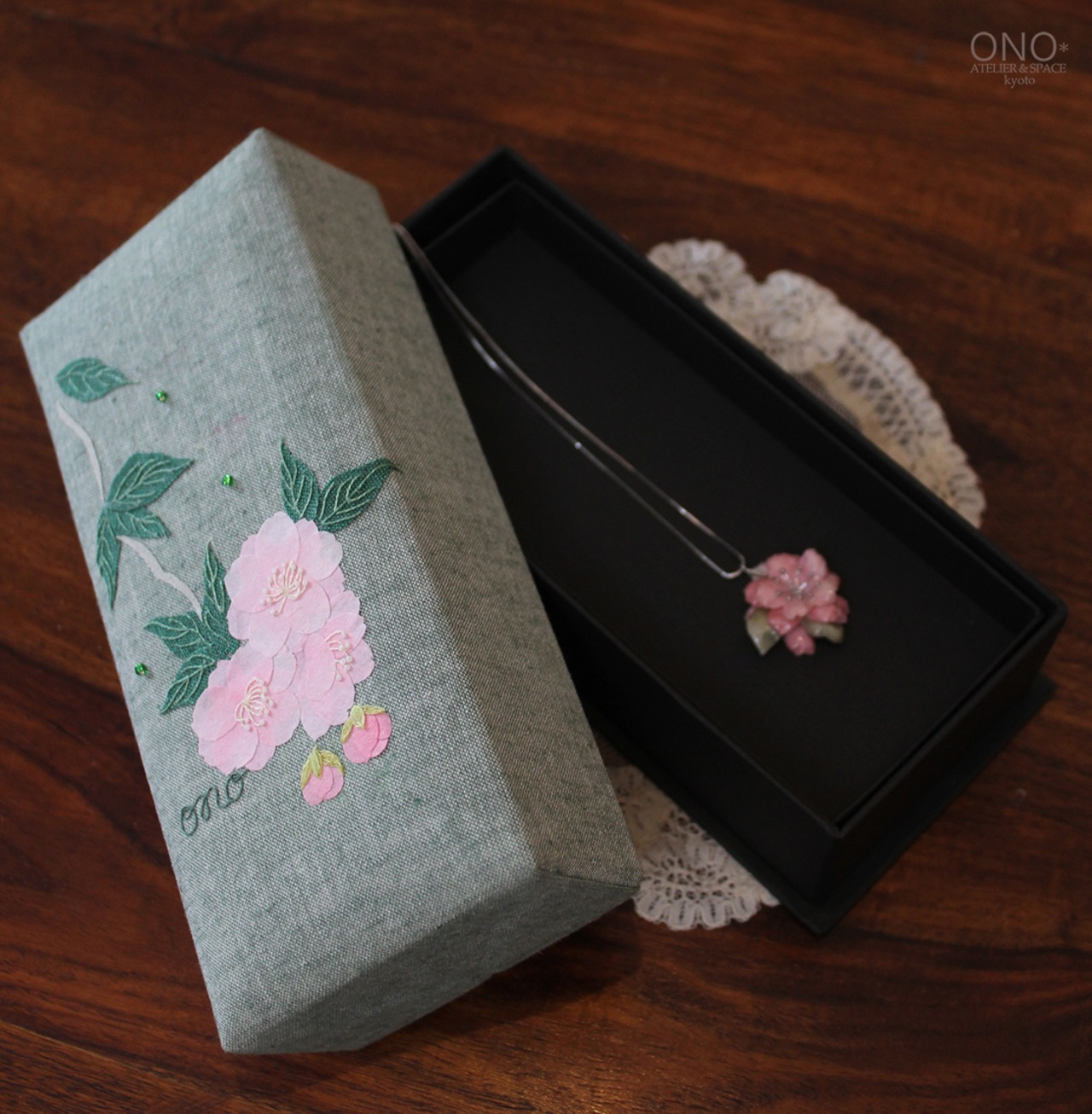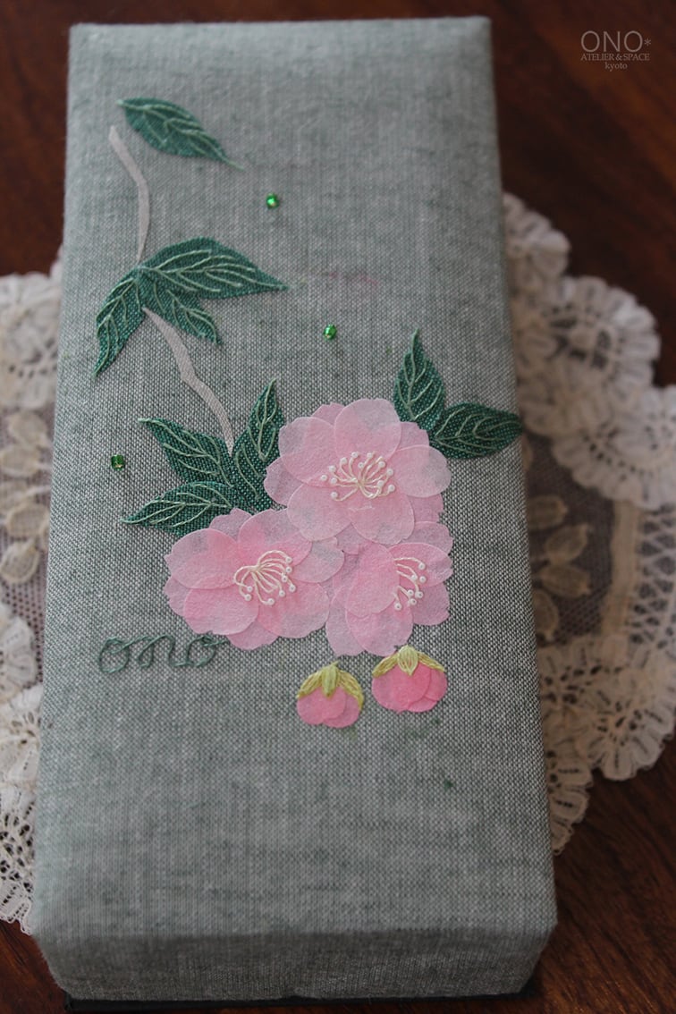 深みのあるグリンのコットンリネンの貼り箱に、リネン布・染め和紙・刺繍糸・ビンテージの極小ビーズを貼り合わせ、八重桜の枝を表現した小箱。