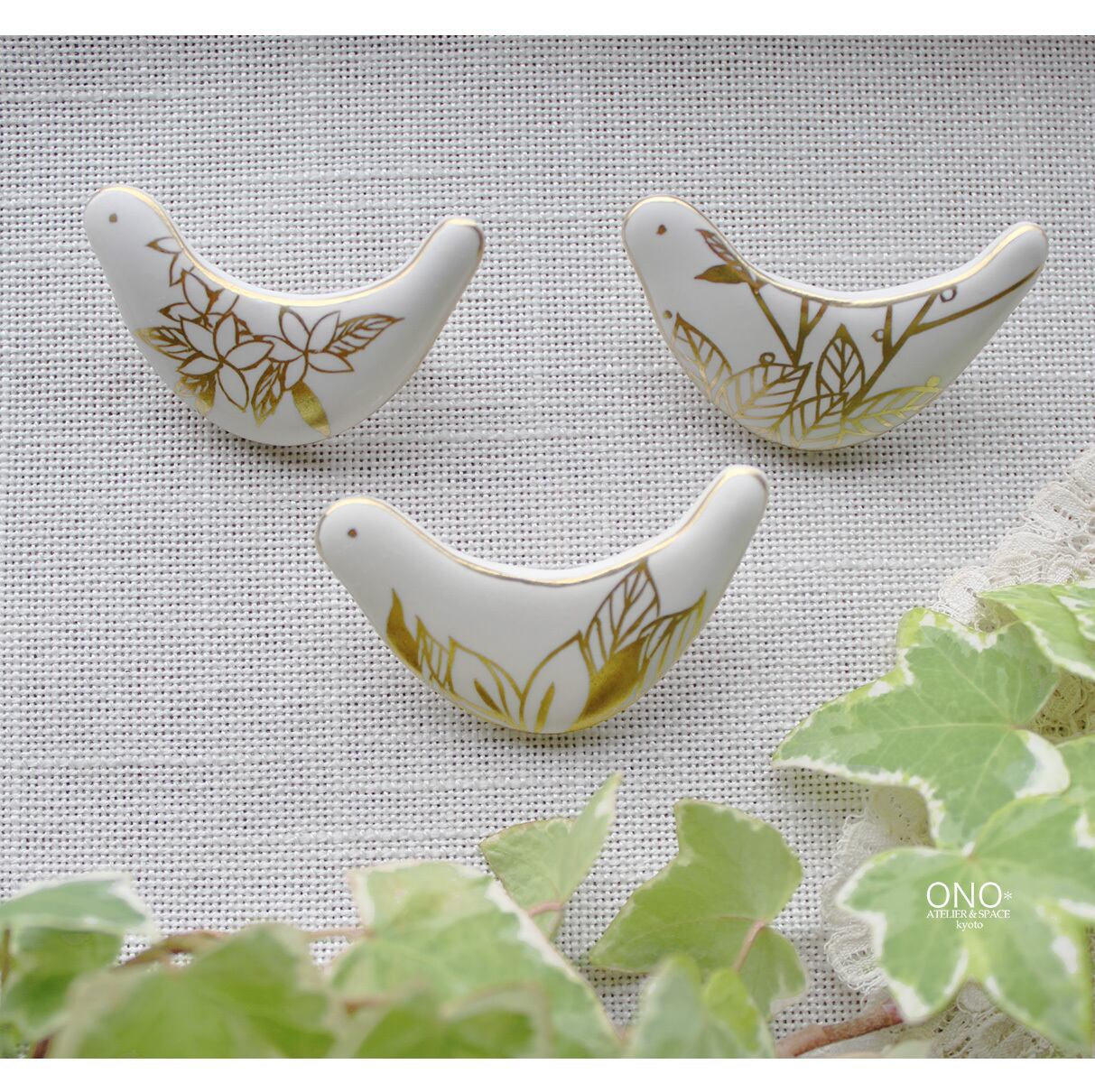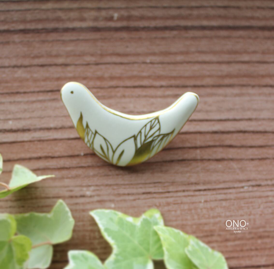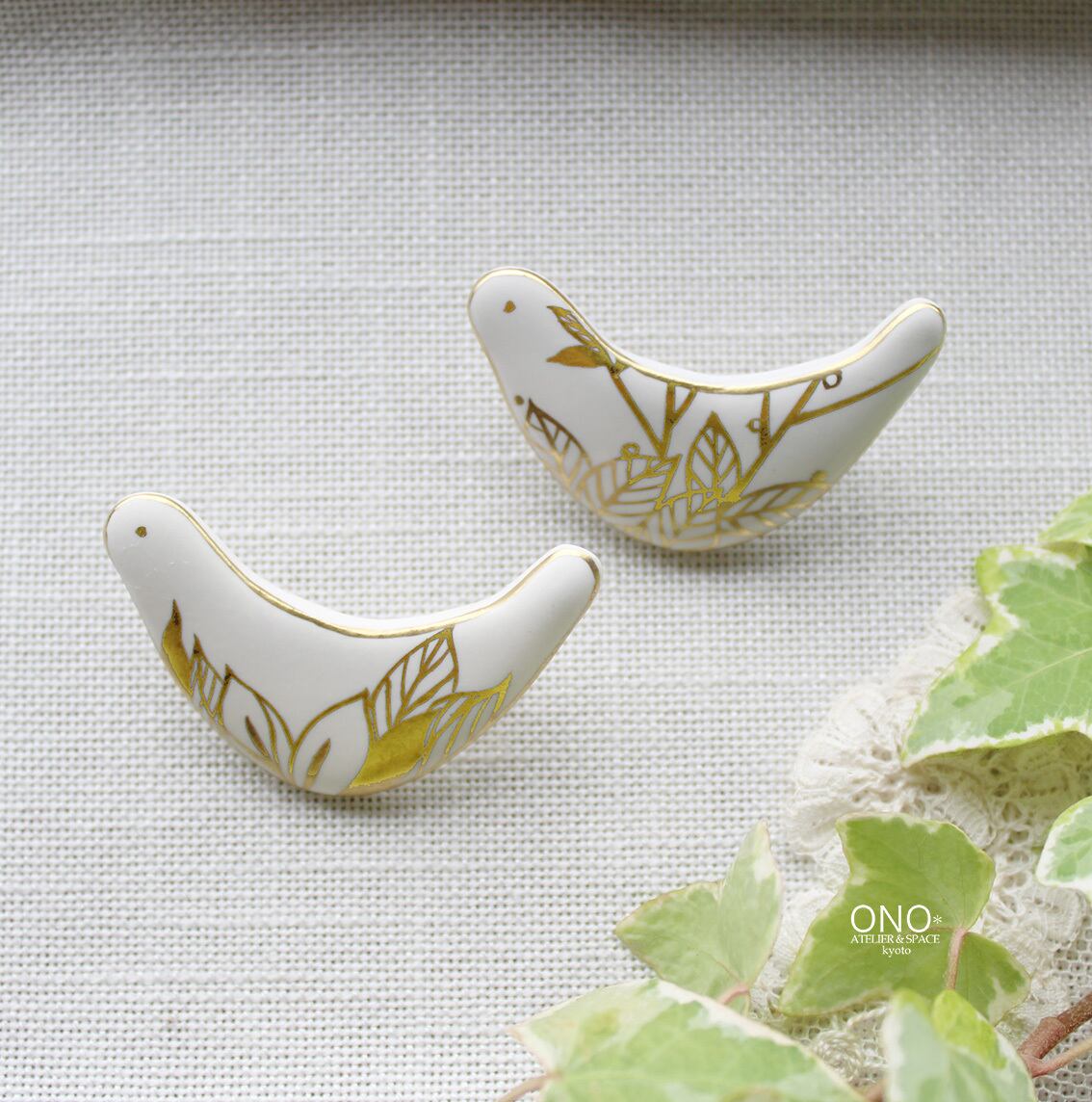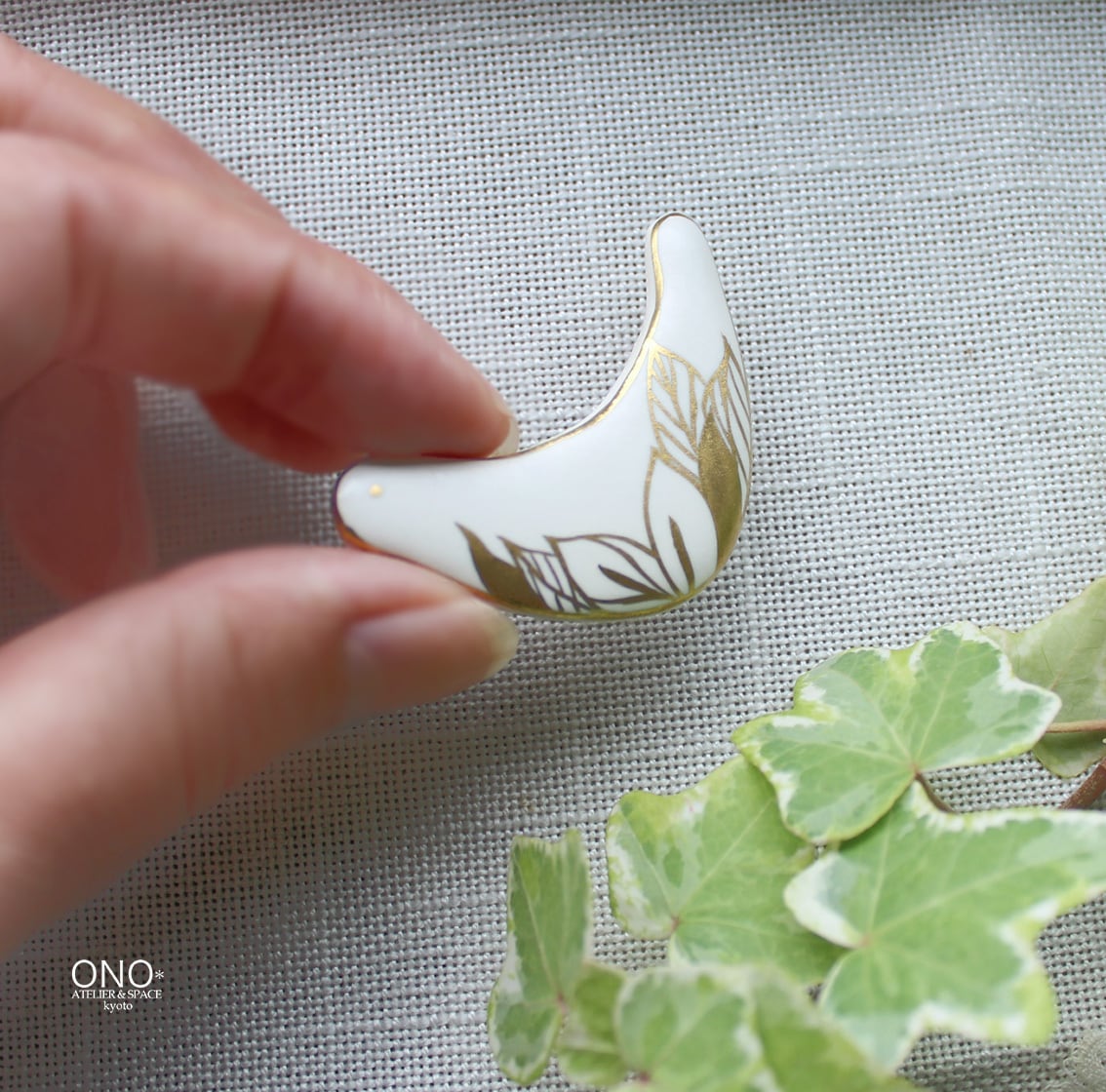 木や鳥、植物をモチーフに金彩や色絵で装飾したアクセサリーを制作