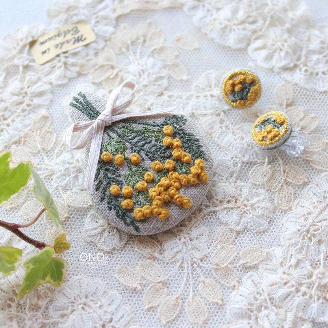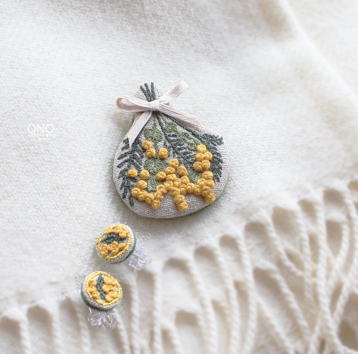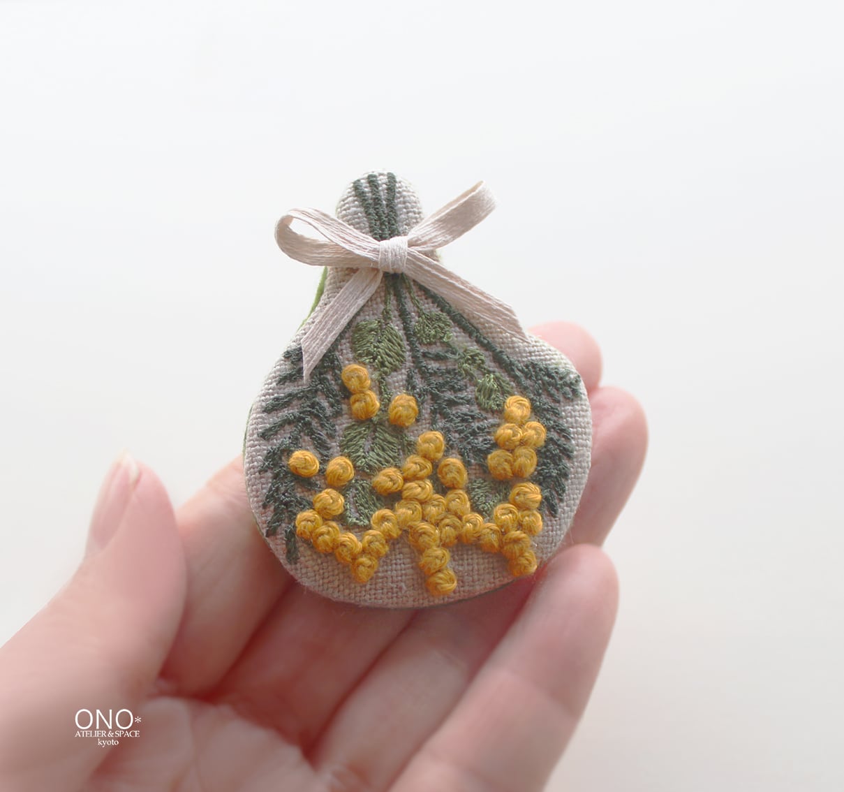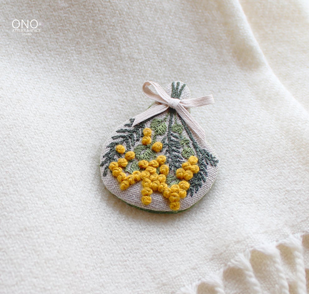 年中楽しめる ミモザとユーカリのスワッグモチーフの刺繍ブローチ。