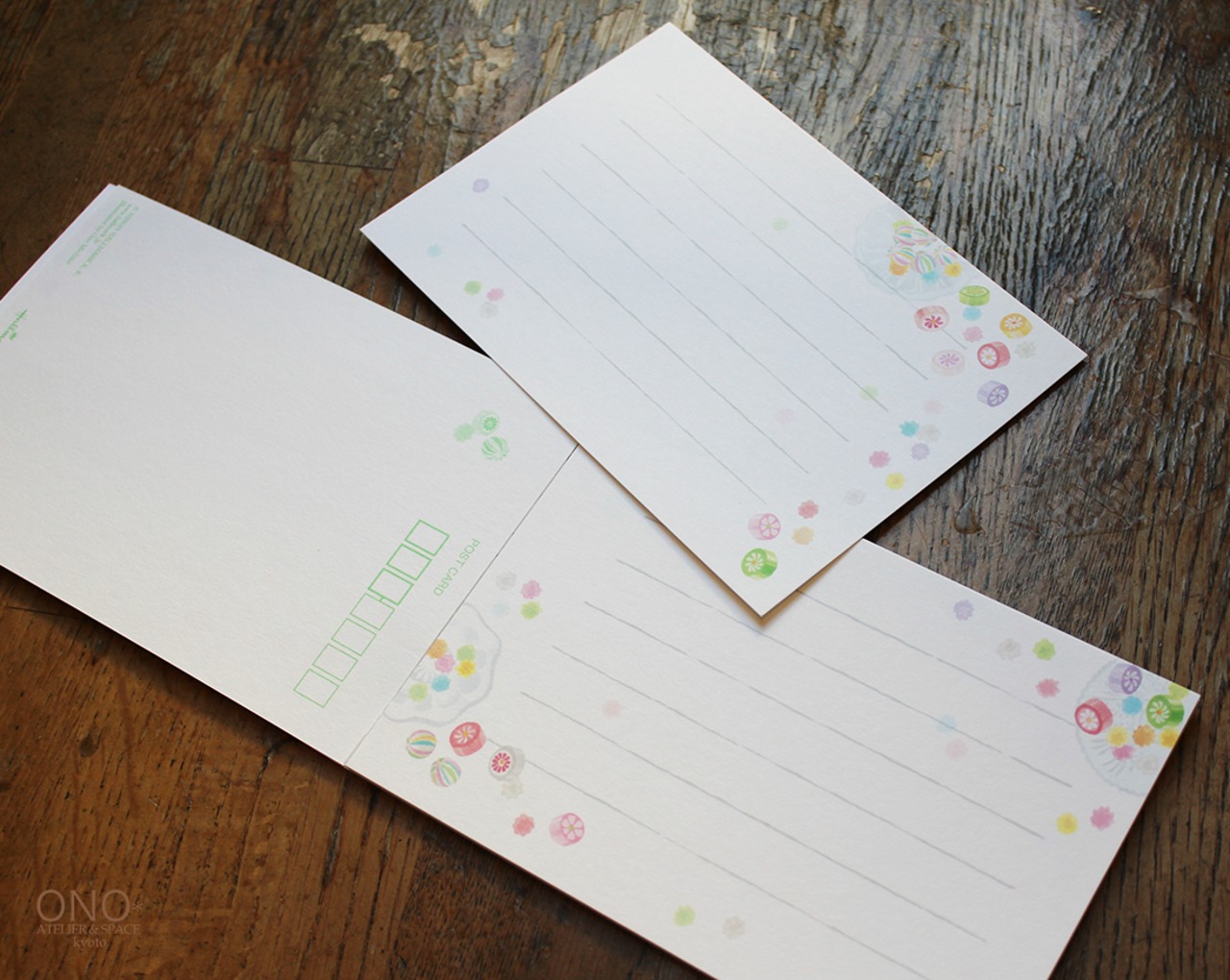 飴や金平糖が、レトロな硝子の器からこぼれ落ちた彩り美しいはがき箋です。