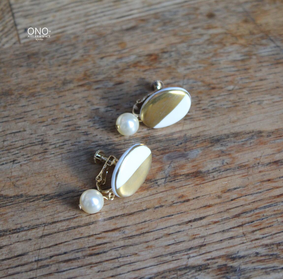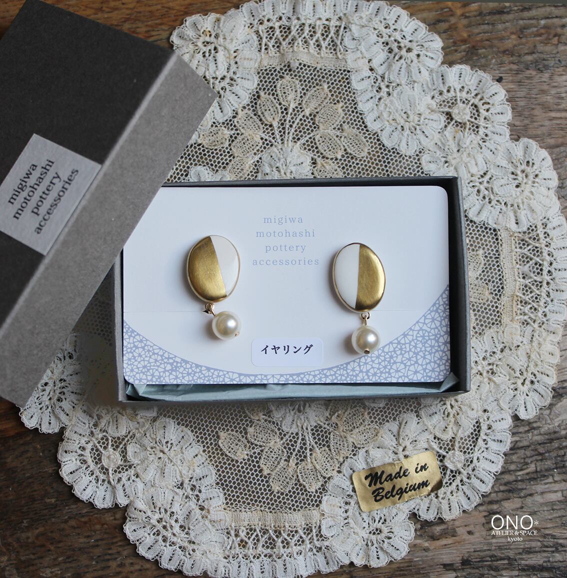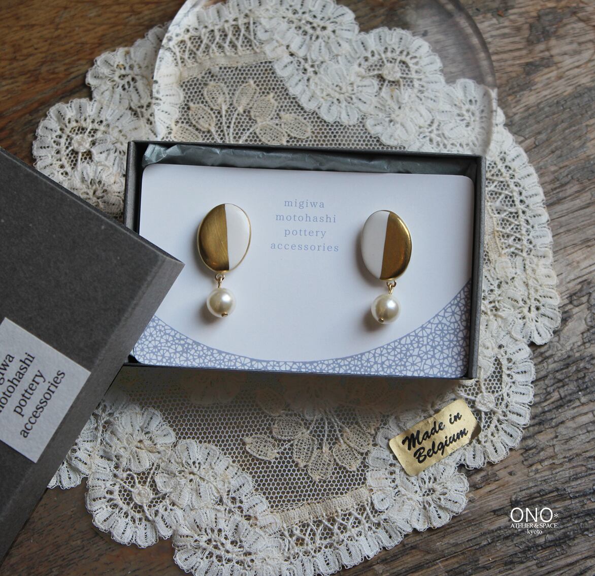 元橋みぎわ 陶イヤリング・ピアス 楕円型金彩&パール