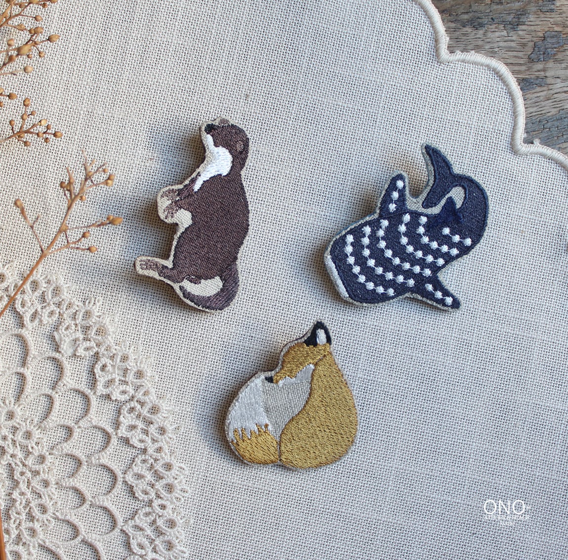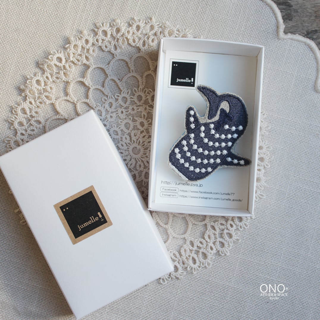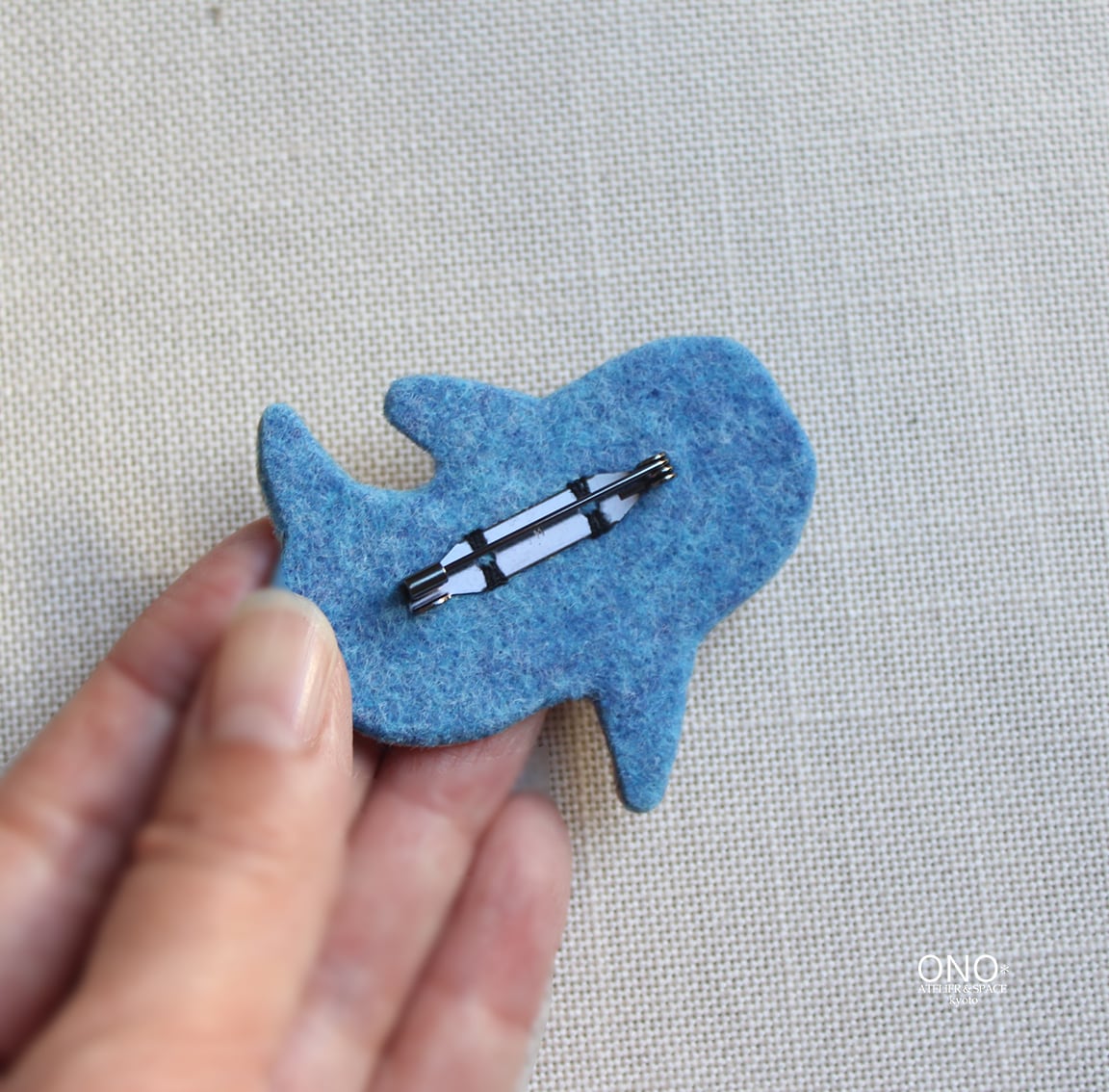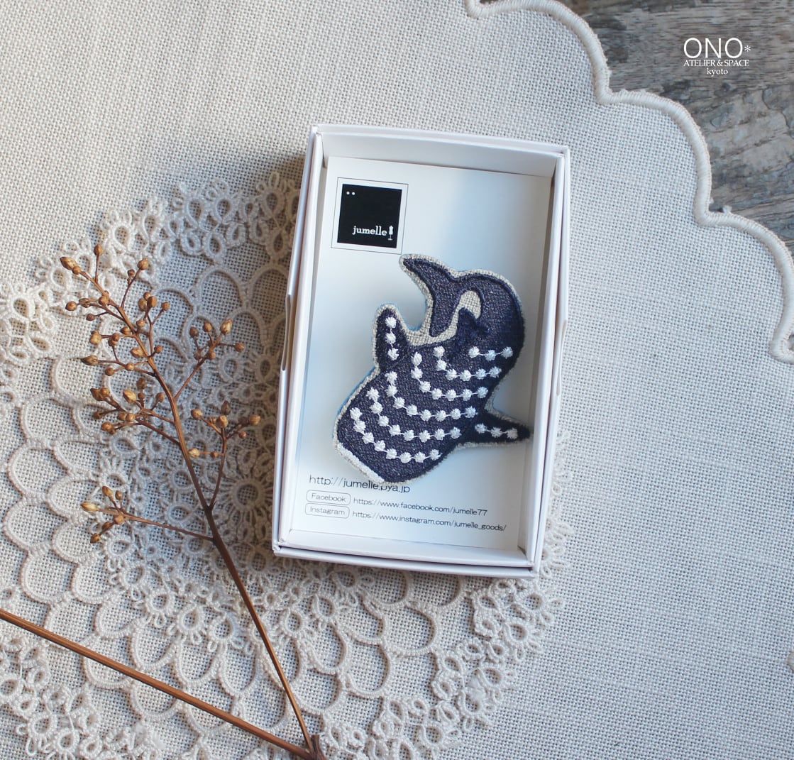 おとなしい性格が可愛らしくて人気のジンベエザメをモチーフにした刺繍ブローチ。