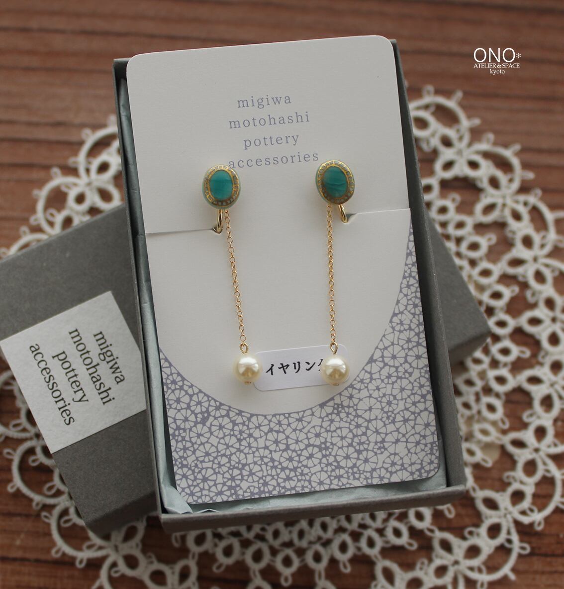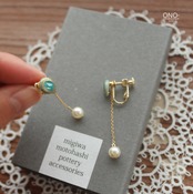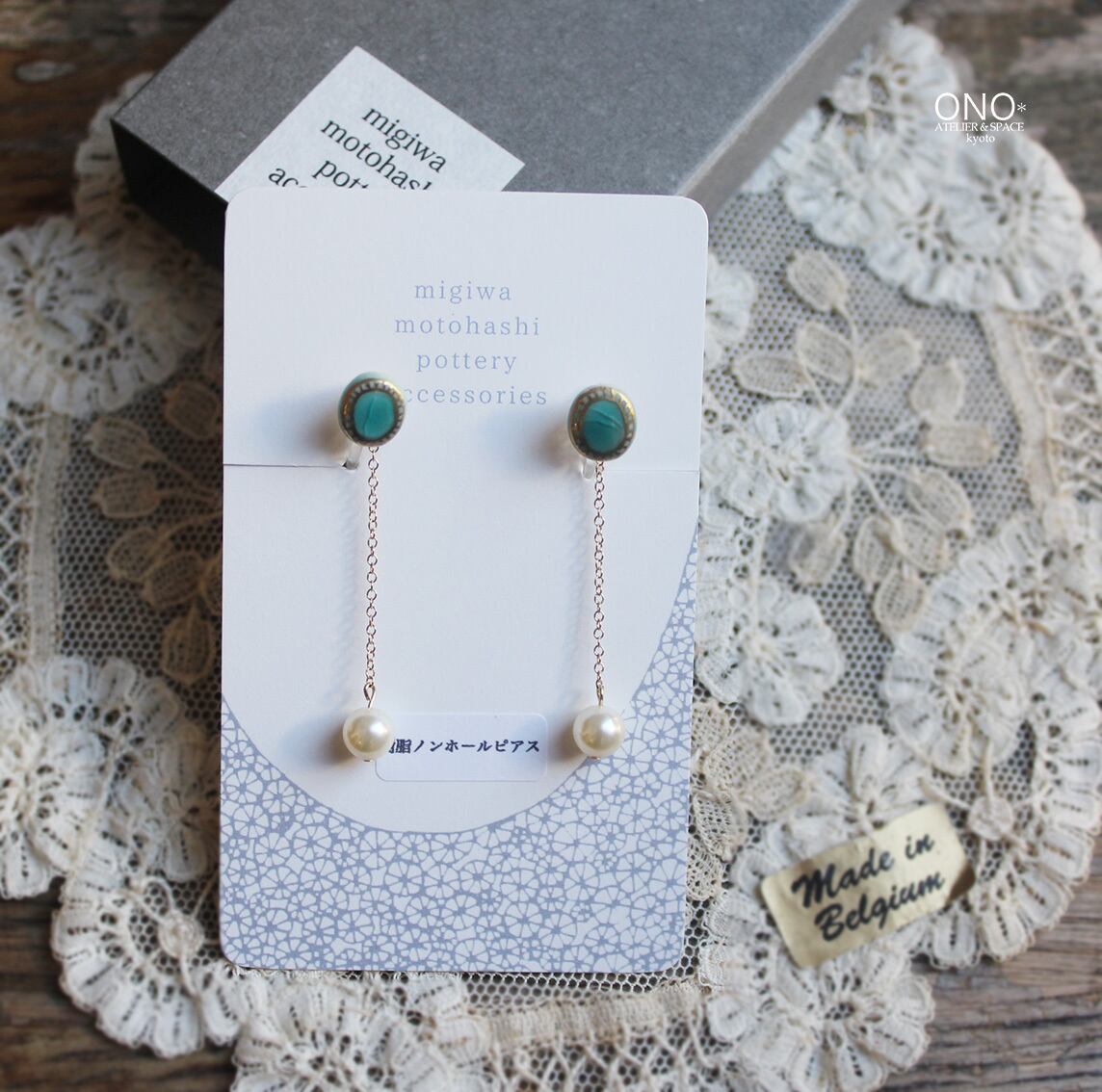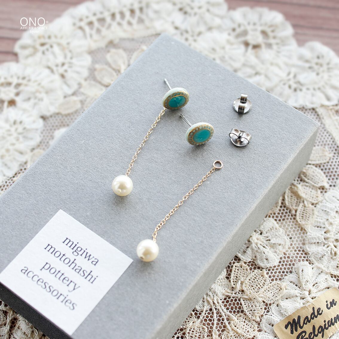 元橋みぎわ 陶イヤリング・ピアス 青釉金彩パールチェーン