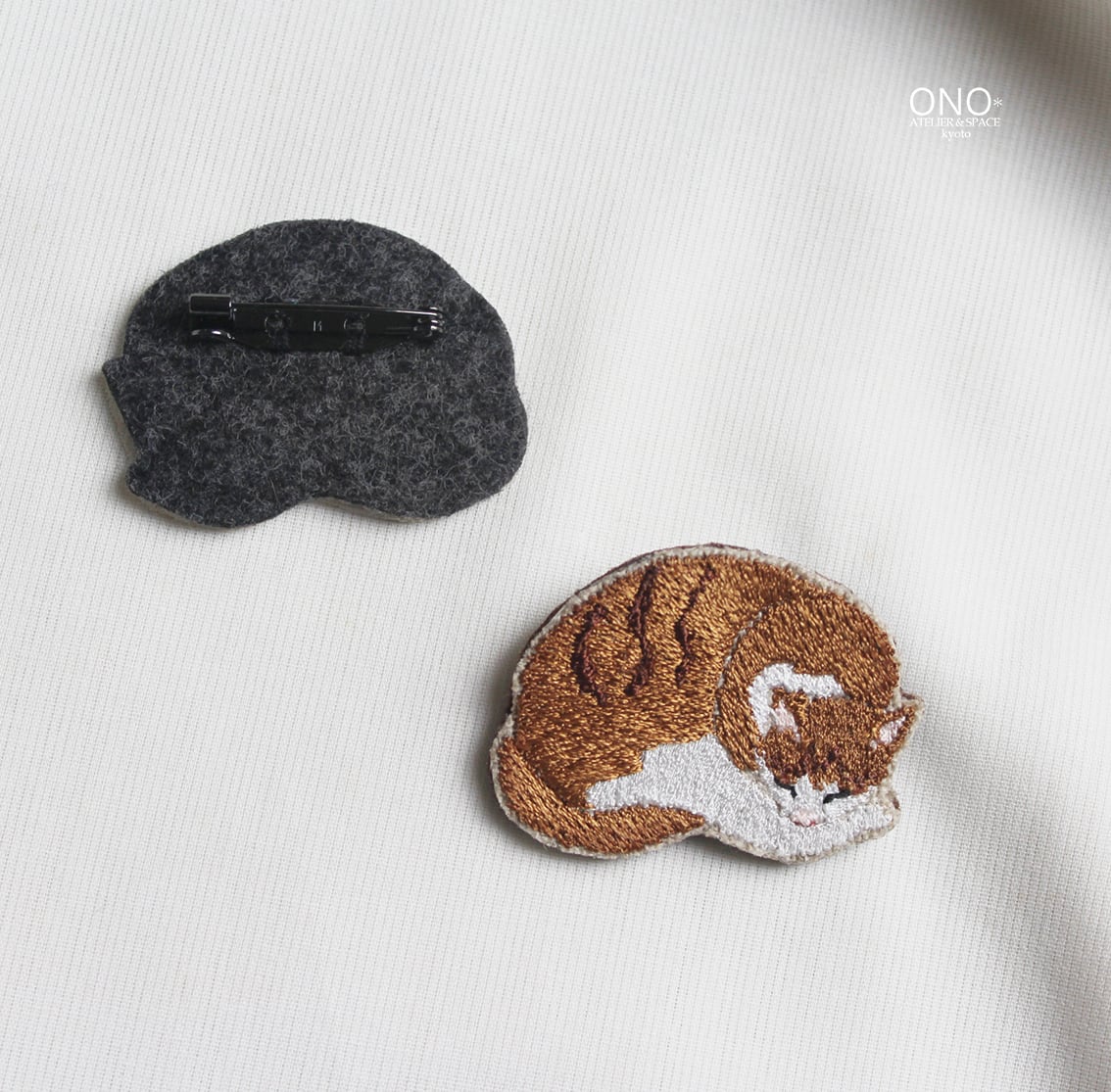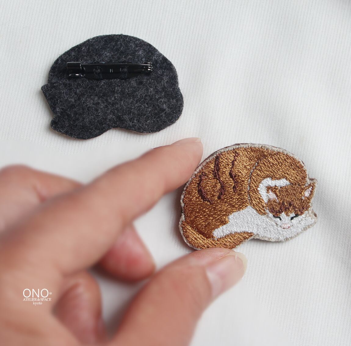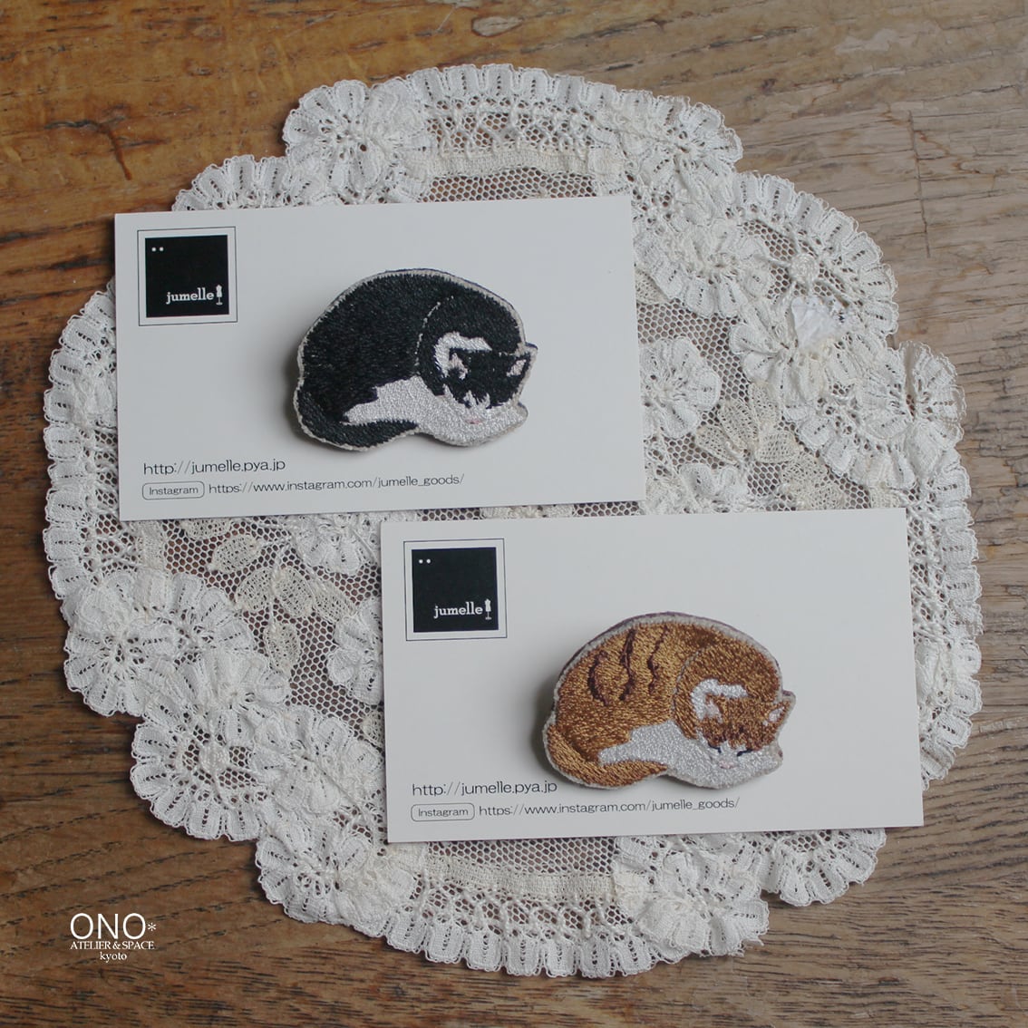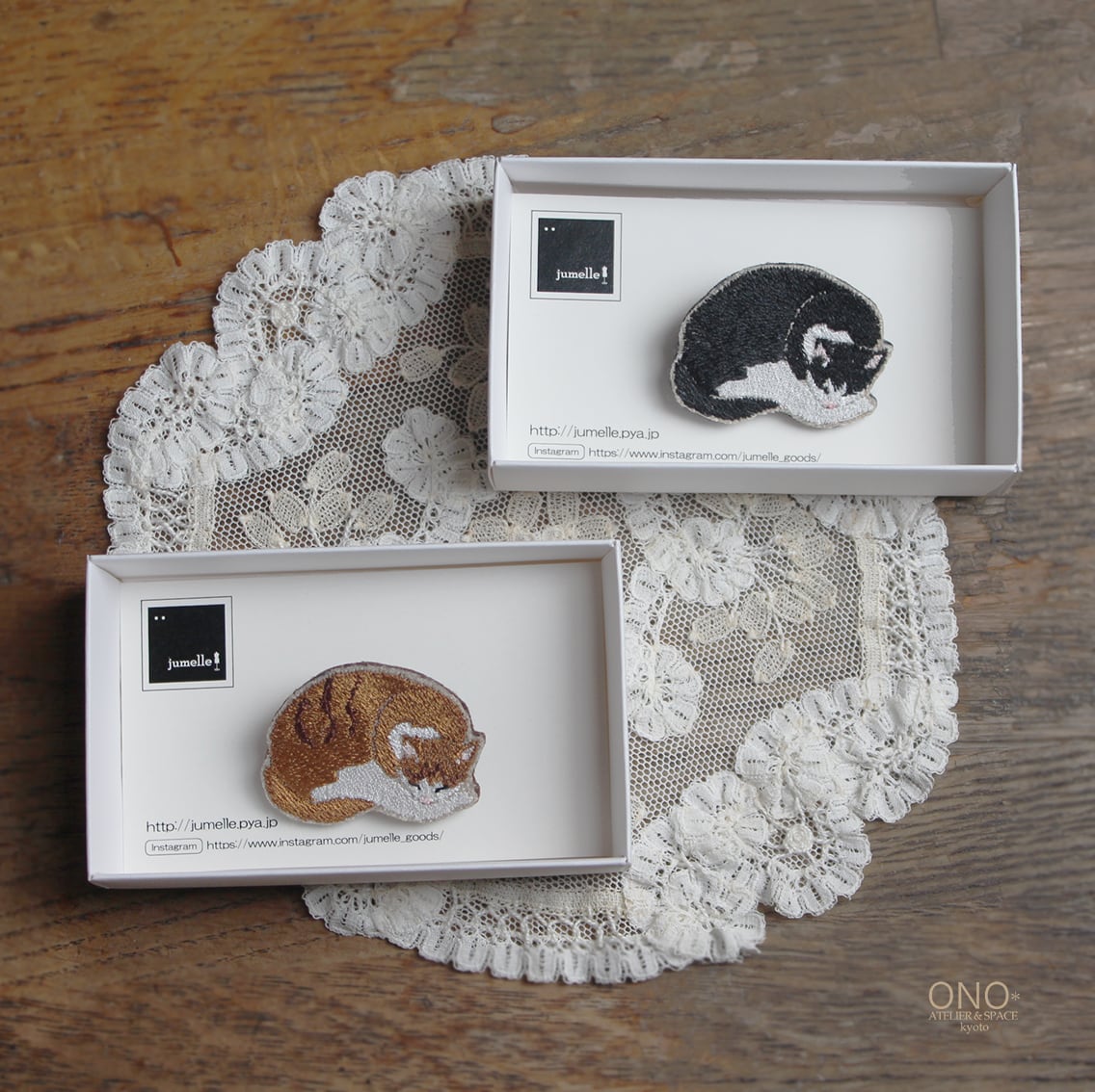 バッグや小物を作るハンドメイド作家 jumelle の猫モチーフの刺繍ブローチ。