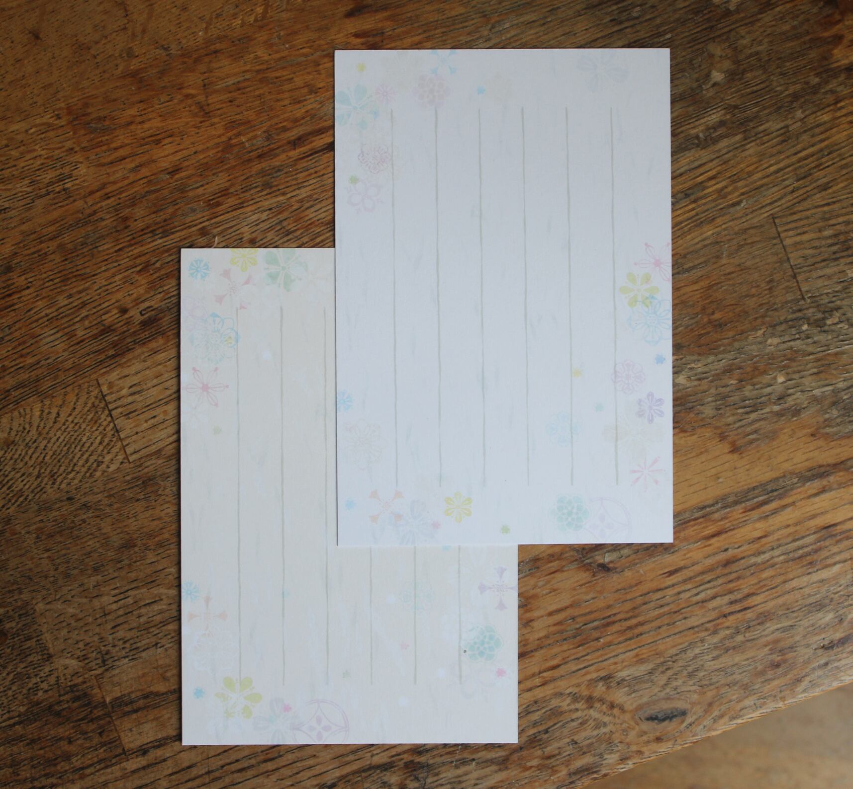 大小さまざまな紋様を重ねて、繊細な奥行きを表現。落ち着いた色味の背景と、幾何学的な紋様の対比が特徴的です。季節やお相手を問わずお使いいただきやすいデザインです。縦書きにも横書きにもお使いいただける罫線です。