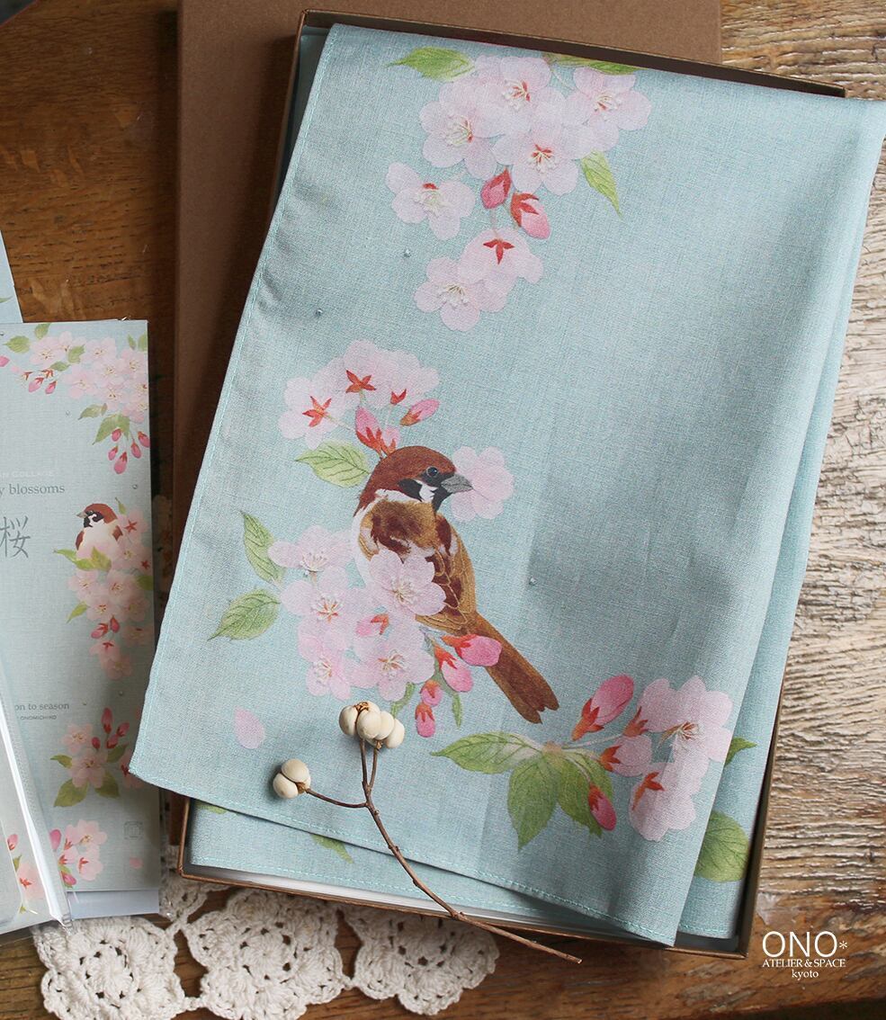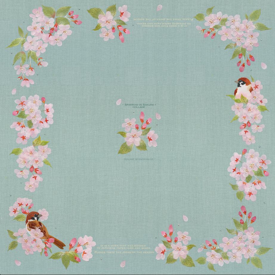 『桜に雀』のコラージュ作品をプリントしたハンカチーフです。