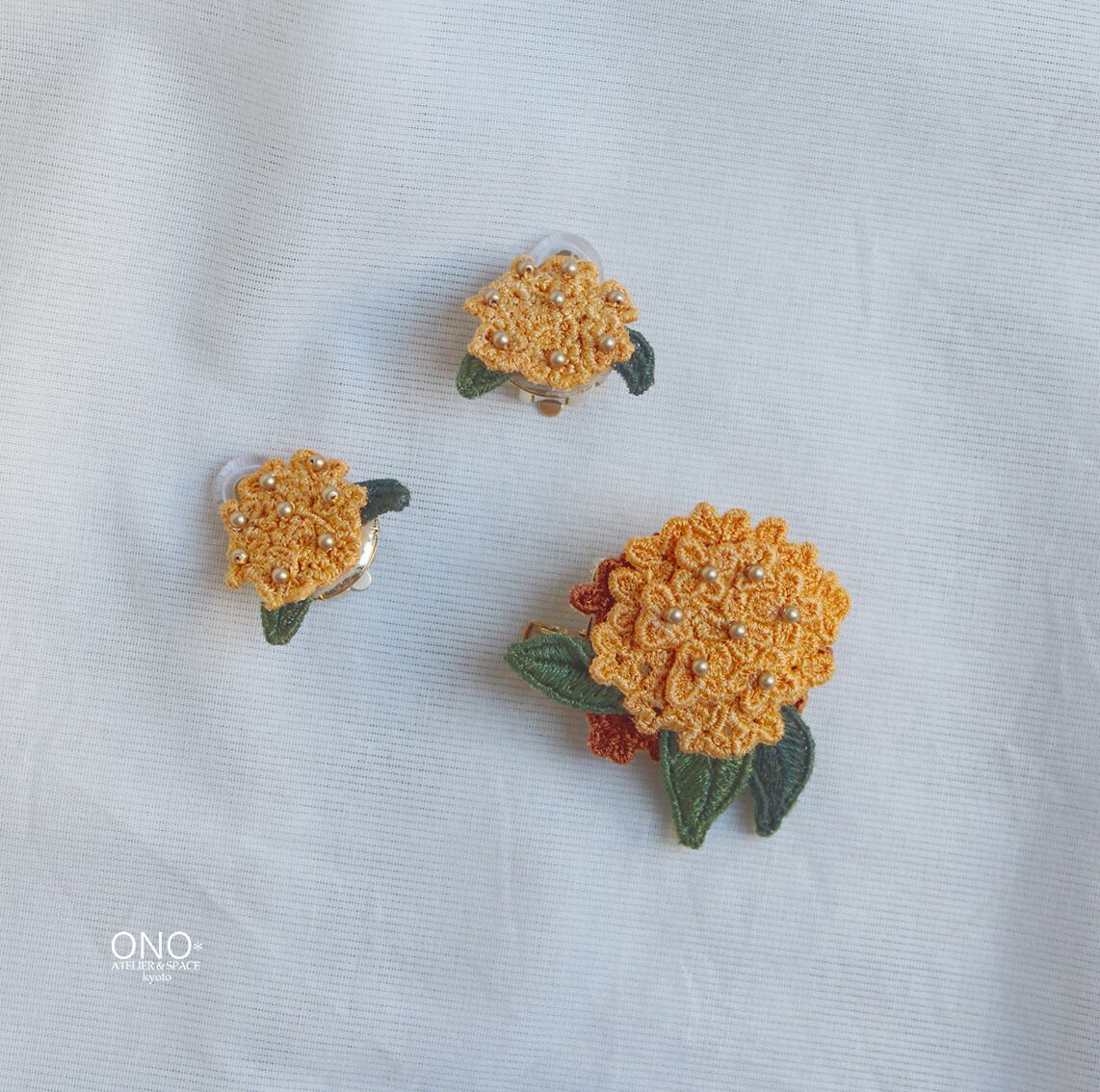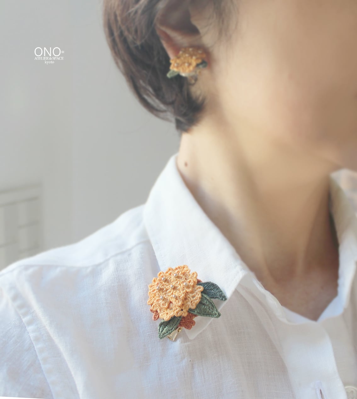 アクセントにヴィンテージゴールドカラーのクリスタルパールビーズをあしらって作品全体に輝きと上品な雰囲気を添えました。