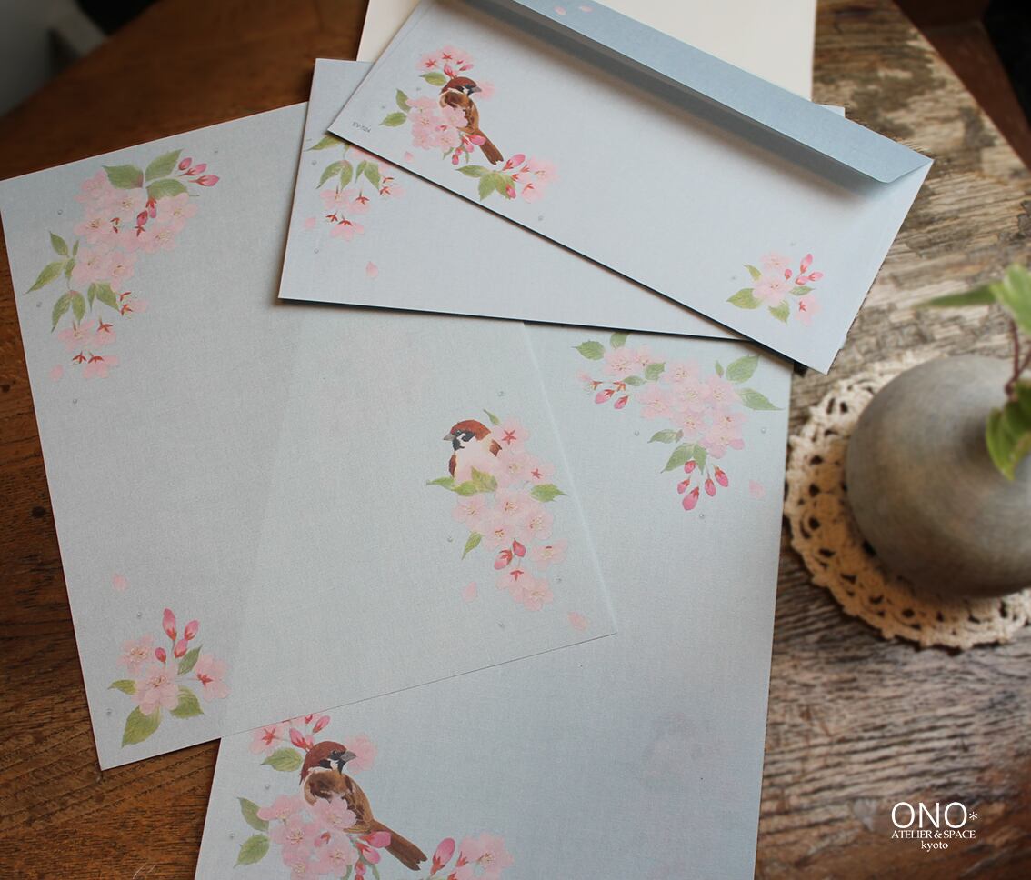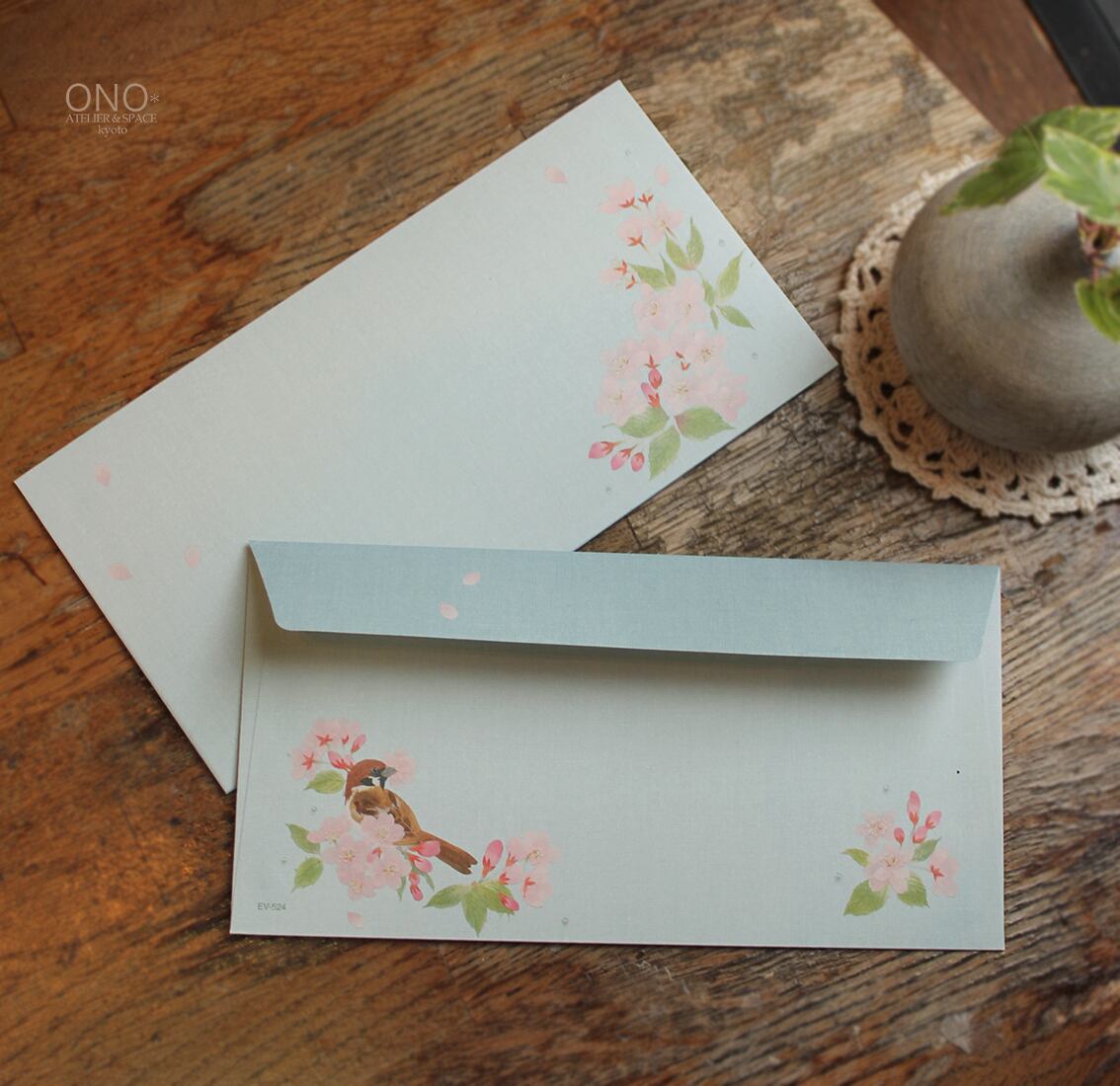 『桜に雀』の便箋や一筆箋とお揃いで使える横型の封筒です。