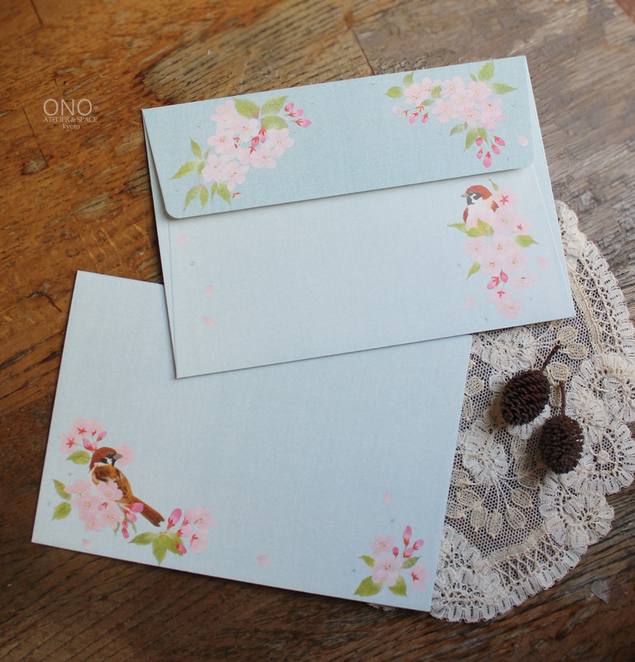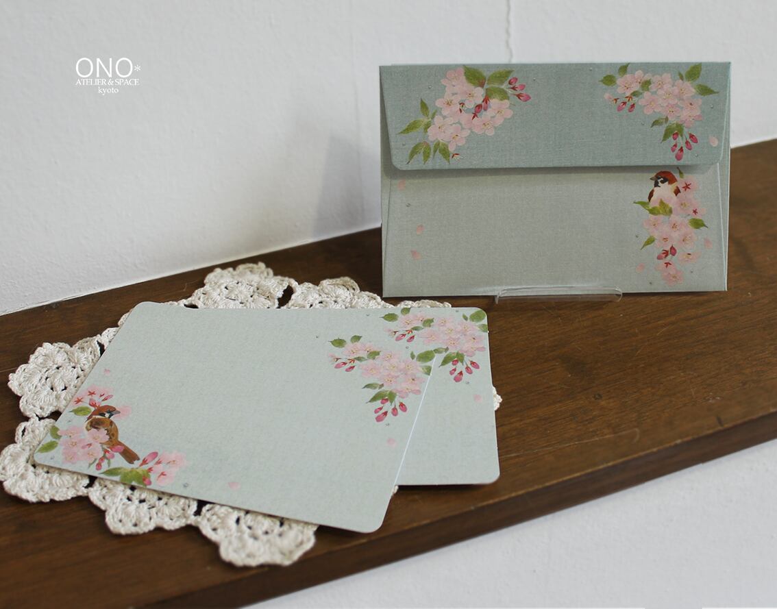 『桜に雀』のコラージュをプリントしたミニレターセット