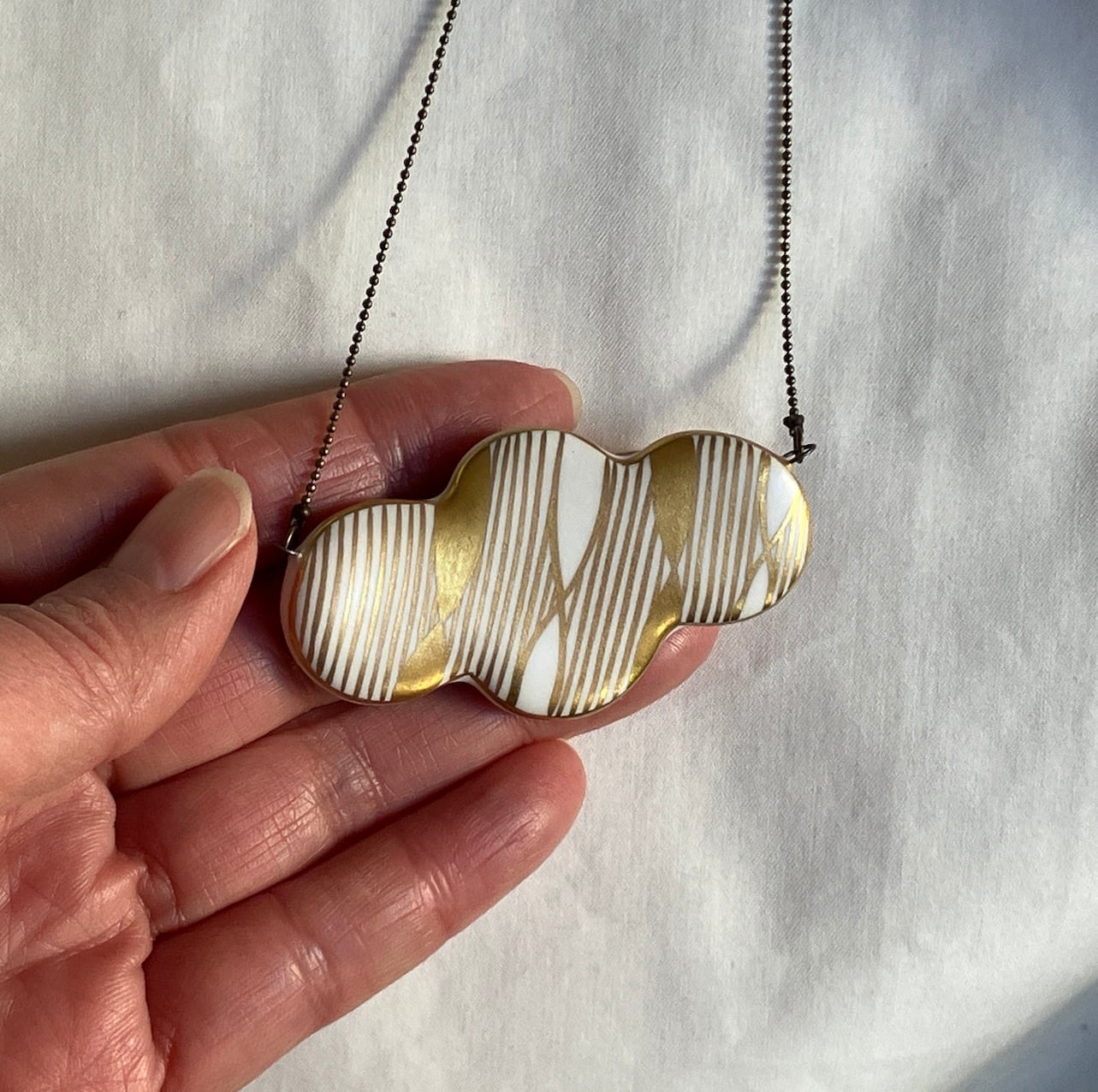 木や鳥、植物をモチーフに金彩や色絵で装飾したアクセサリーを制作